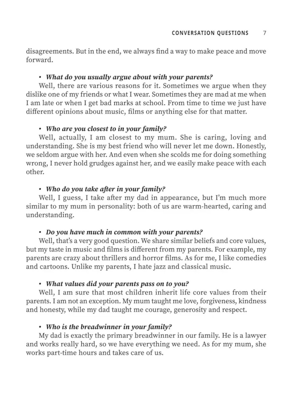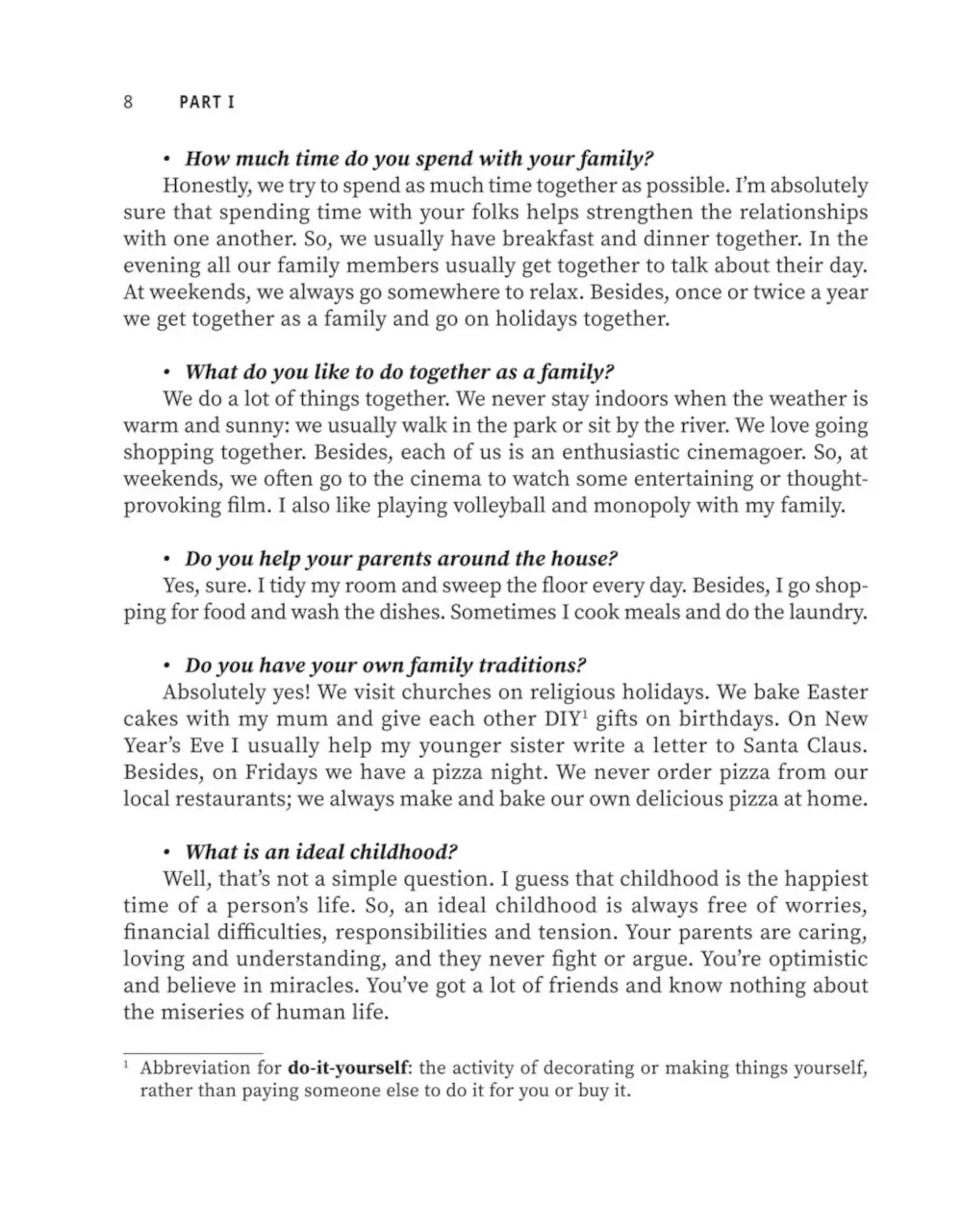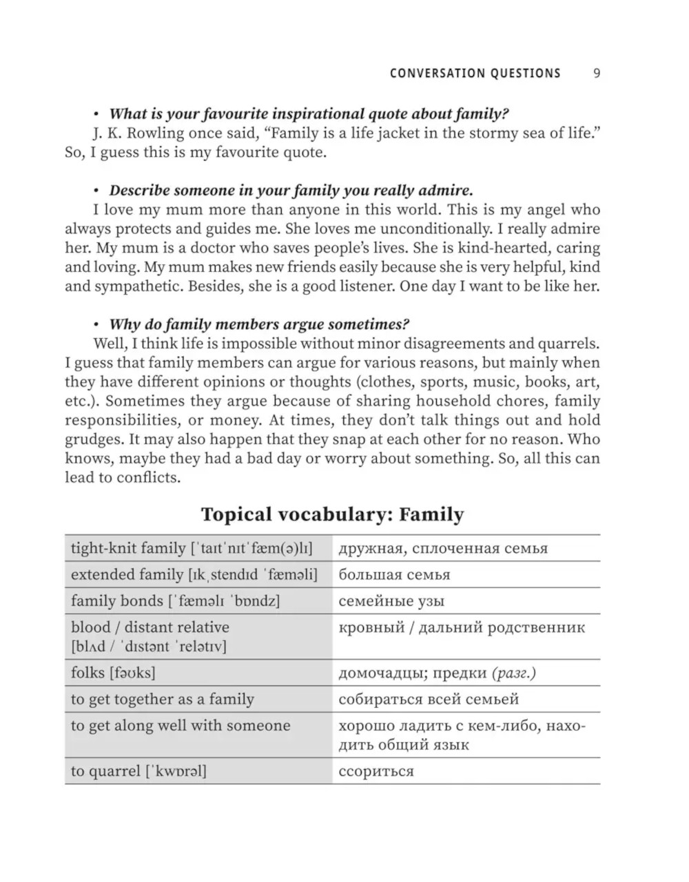 Книга "Тренируем английский: топ вопросов и ответов для разговорной практики" - это универсальный инструмент для развития коммуникативных навыков читателей с разными целями и уровнем владения английским языком. Во-первых, книга может стать незаменимым помощником для преподавателей и репетиторов, которые в начале занятий смогут проводить речевую разминку (warm-up activities) с целью мотивации к общению. Во-вторых, книга может заинтересовать всех, кто планирует сдавать экзамен по английскому языку, включая ЕГЭ, ОГЭ и различные международные тесты. Ведь, как известно, раздел "Говорение" включен в программу любого экзамена и является стресс-фактором для многих экзаменуемых. И в-третьих, данный курс может стать путеводителем в мир разговорной практики для всех изучающих английский язык. Читатели смогут попрактиковаться в ответах на самые распространённые вопросы собеседований, научатся выстраивать монологические высказывания, а значит, смогут уверенно почувствовать и проявить себя как на экзамене, так и в повседневной жизни. Книга состоит из двух разделов: "Вопросы для обсуждения" (Conversation Questions) и "Пословицы и поговорки" (Proverbs & Sayings). Для более эффективного освоения материала после каждого раздела представлен базовый тематический словарь (Topical Vocabulary). В книге рассмотрены самые актуальные темы, такие как "Семья", "Друзья", "Работа", "Любовь", "Здоровье", "Покупки", "Мода", "Путешествия" и другие.| Издательство | Феникс |
