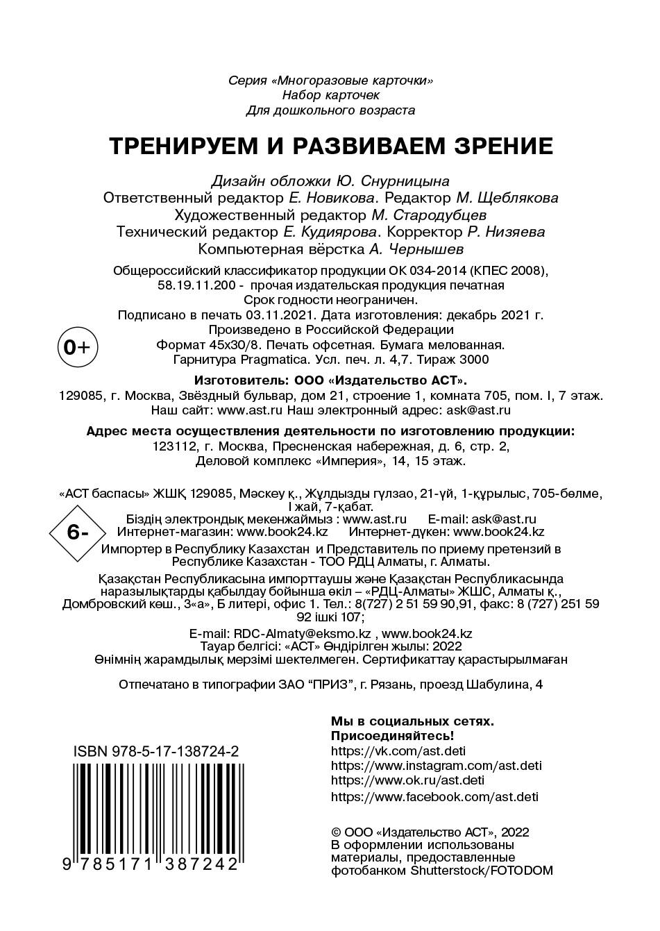 О чём эта книга «Тренируем и развиваем зрение» - это набор карточек для коррекции и поддержки зрения. В набор входит 35 двухсторонних карточек с заданиями, которые помогут ребёнку повысить остроту зрения, снять напряжение, снизить утомляемость глаз. Кому эта книга будет интересна Набор карточек для детей дошкольного и младшего школьного возраста. Каковы особенности этой книги • 35 двухсторонних карточек. • Разнообразные игровые задания для тренировки зрения. • Красочные иллюстрации.| Издательство | АСТ |