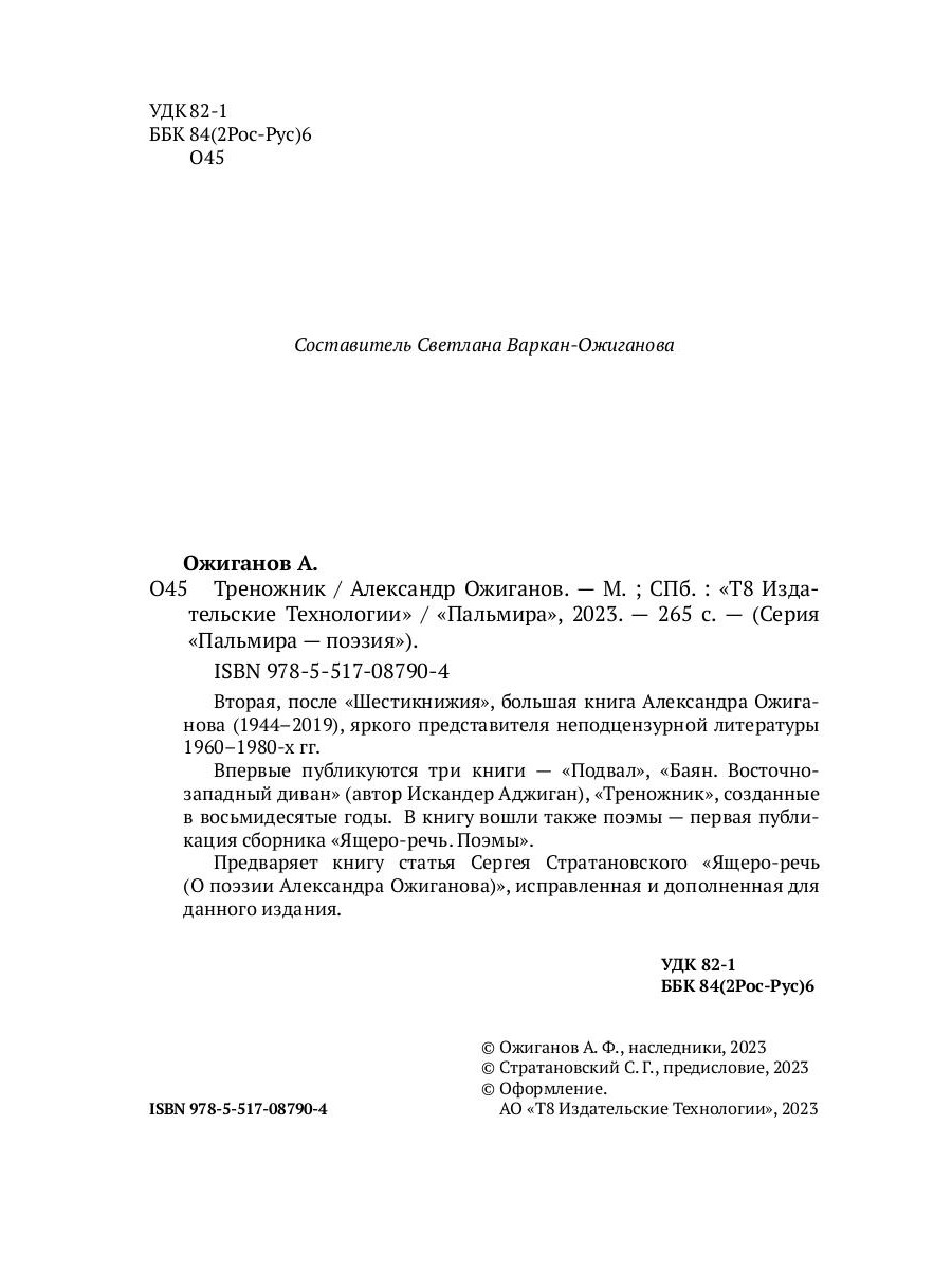 Александр Ожиганов (1944-2019) - поэт и литературный критик, яркий представитель неподцензурной литературы 1960-1980-х годов. "Треножник" - второй большой сборник Александра Ожиганова после "Шестикнижия", в котором впервые публикуются три книги: "Подвал", "Баян. Восточно-западный диван" и "Треножник", а также сборник поэм "Ящеро-речь". "Странная поэтика стихов Ожиганова - несколько сюрреалистичная, глуховато-взрывчатая, обостренно-совестливая - коренится глубоко и в заветах русского Серебряного века, и в традициях европейского неоромантизма". Виктор Кривулин| Издательство | Т8 RUGRAM |