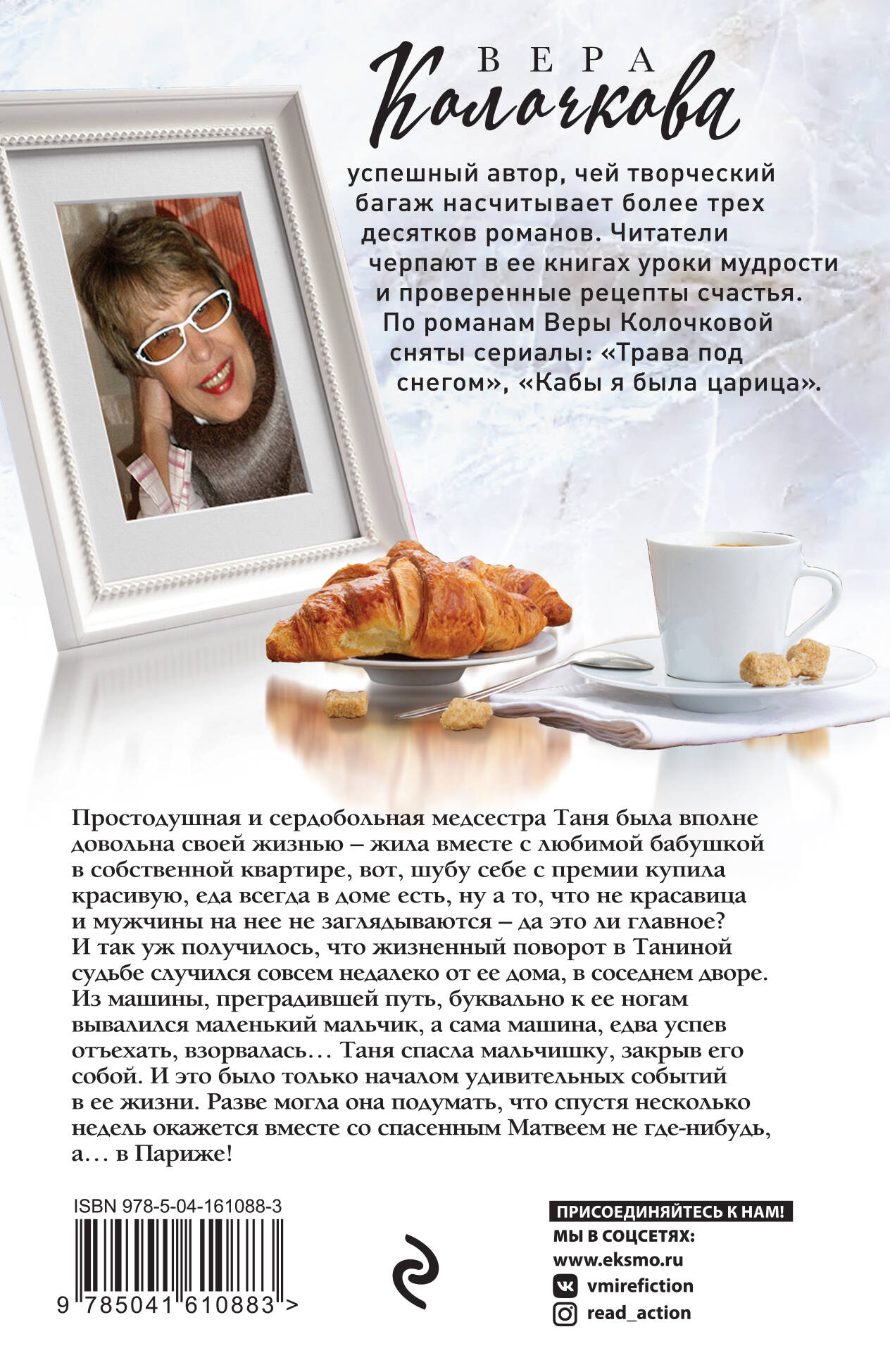 Библиография Веры Колочковой насчитывает более 40 романов, многие из которых уже воплощены на экране. Любовь к автору вполне объяснима, ведь она пишет об обычных людях, которые стремятся к лучшей жизни и борются за собственное счастье. Простые и чувственные, увлекательные и романтичные, романы Колочковой задевают за живое, заставляя сопереживать и радоваться героям как своим знакомым. Простодушная и сердобольная медсестра Таня была вполне довольна своей жизнью - жила вместе с любимой бабушкой в собственной квартире, вот, шубу себе с премии купила красивую, еда всегда в доме есть, ну а то, что не красавица и мужчины на нее не заглядываются - да это ли главное? И так уж получилось, что жизненный поворот в Таниной судьбе случился совсем недалеко от ее дома, в соседнем дворе. Из машины, преградившей путь, буквально к ее ногам вывалился маленький мальчик, а сама машина, едва успев отъехать, взорвалась… Таня спасла мальчишку, закрыв его собой. И это было только началом удивительных событий в ее жизни. Разве могла она подумать, что спустя несколько недель окажется вместе со спасенным Матвеем не где-нибудь, а… в Париже!| Издательство | ООО "Издательство "Эксмо" |