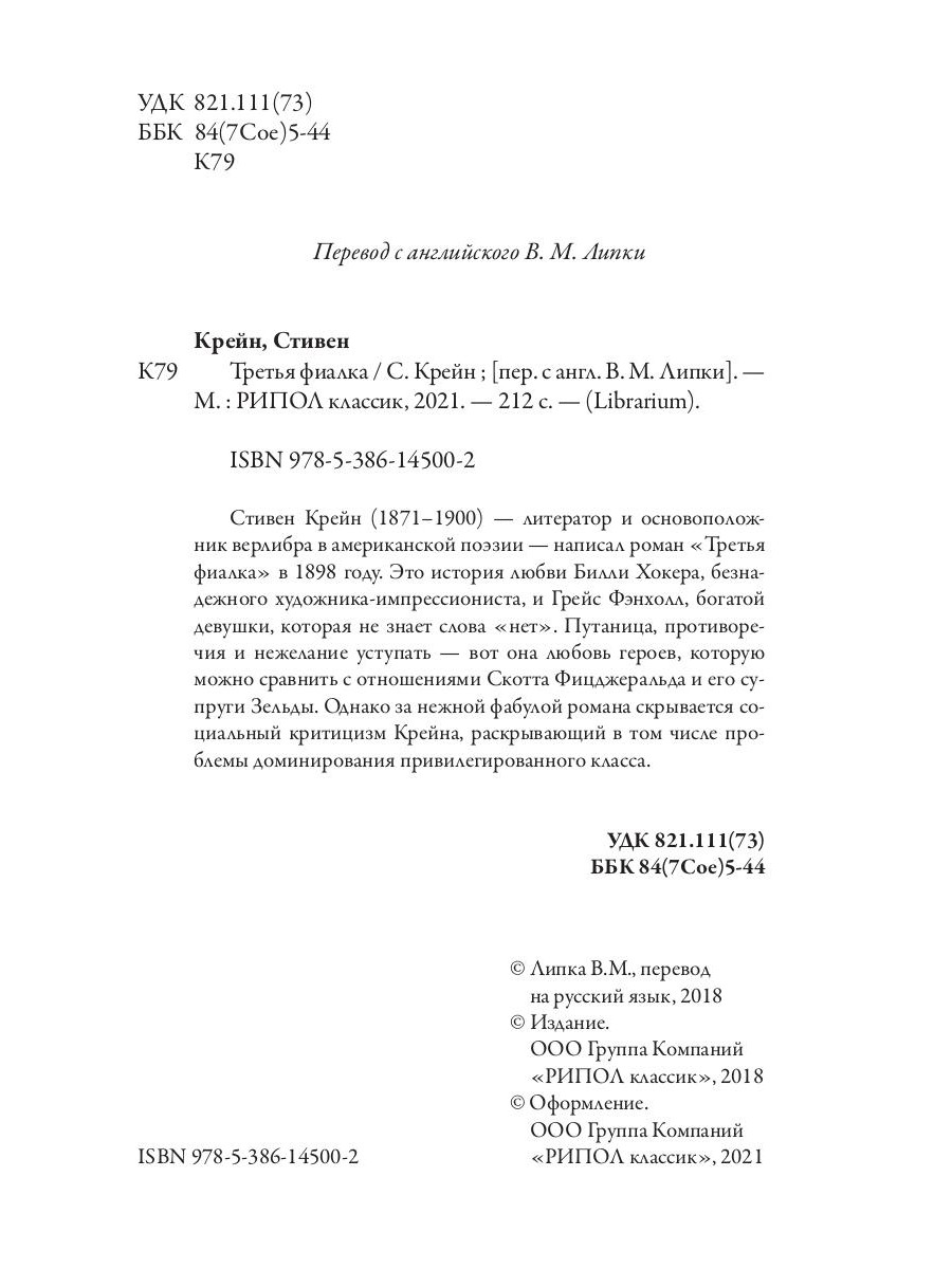 Стивен Крейн (1871-1900) - литератор и основоположник верлибра в американской поэзии - написал роман «Третья фиалка» в 1898 году. Это история любви Билли Хокера, безнадежного художника-импрессиониста, и Грейс Фэнхолл, богатой девушки, которая не знает слова «нет». Путаница, противоречия и нежелание уступать - вот она любовь героев, которую можно сравнить с отношениями Скотта Фицджеральда и его супруги Зельды. Однако за нежной фабулой романа скрывается социальный критицизм Крейна, раскрывающий в том числе проблемы доминирования привилегированного класса.| Издательство | Рипол Классик |