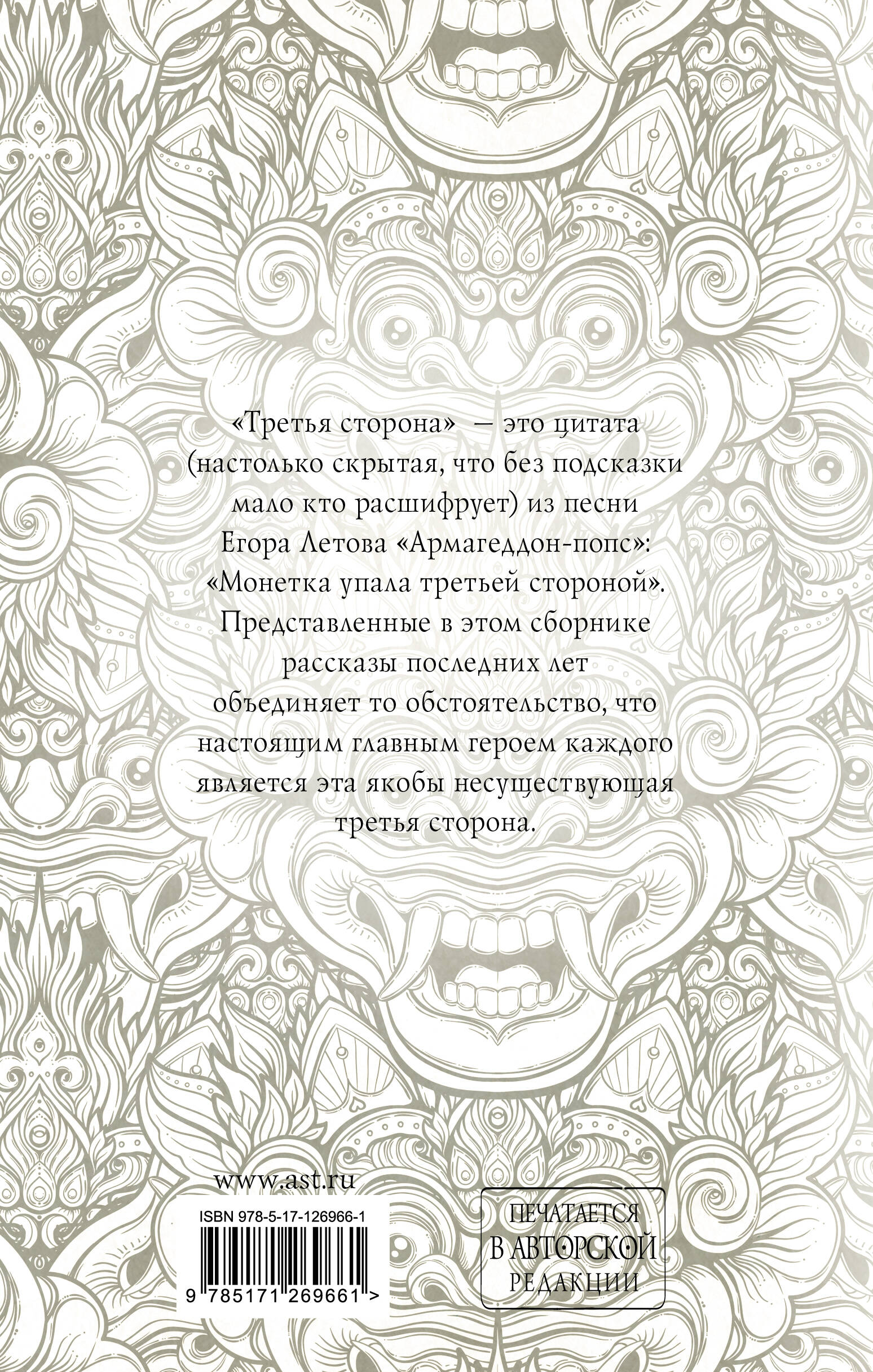 «Третья сторона» - это цитата (настолько скрытая, что без подсказки мало кто расшифрует) из песни Егора Летова «Армагеддон-попс»: «Монетка упала третьей стороной». Представленные в этом сборнике рассказы последних лет объединяет то обстоятельство, что настоящим главным героем каждого является эта якобы несуществующая третья сторона.| Издательство | ИЗДАТЕЛЬСТВО "АСТ" |
