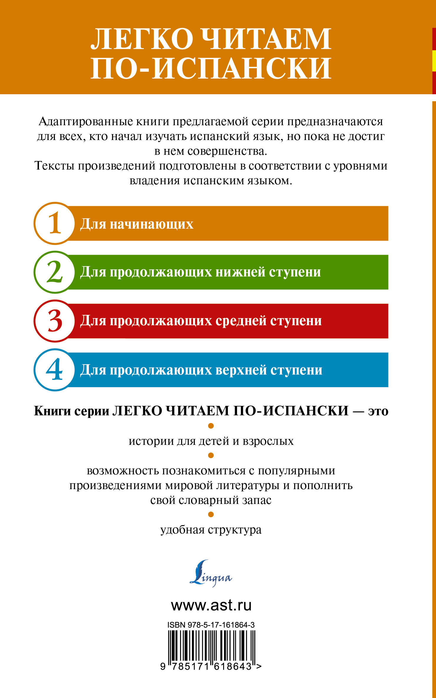 "Треугольная шляпа" - занимательная повесть Педро Антонио де Аларкона, написанная в 1874 году и имевшая огромный успех. Автор рассказывает о том, как мельник наказал чиновника, ухаживающего за его женой - козни и злоключения владельца треуголки являются основой сюжета, позаимствованного из романса XVIII века. Писатель ярко и остроумно отразил быт и взгляды жителей Испании тех времен. Текст книги сокращён, адаптирован и сопровождается комментариями и упражнениями с ответами. Также в конце книги вы найдёте небольшой испанско-русский словарь, который поможет вам с выполнением заданий. Пособие предназначается для начинающих изучать испанский язык (уровень 1 - для начинающих А1-А2). Небольшой формат издания позволяет читать произведение как дома, так и в поездке.| Издательство | Издательство "АСТ" |