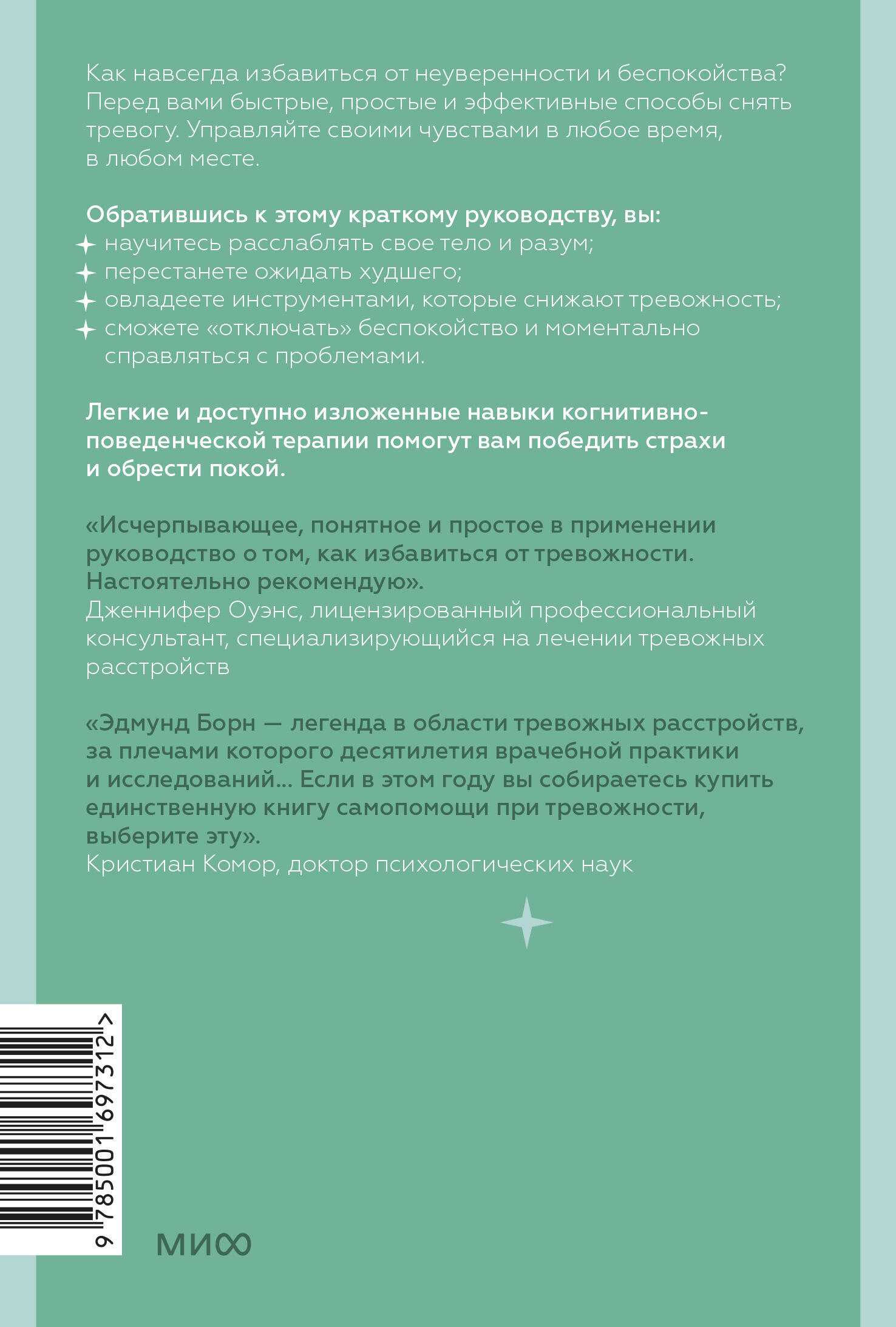 Краткое руководство доктора философии Эдмунда Борна и Лорны Гарано обобщает обширный опыт в области исследования и лечения хронического беспокойства, фобий и тревожных расстройств. Как навсегда избавиться от неуверенности и беспокойства? Перед вами быстрые, простые и эффективные способы снять тревогу. Управляйте своими чувствами в любое время, в любом месте. Обратившись к этому краткому руководству, вы научитесь расслаблять свое тело и разум; перестанете ожидать худшего; будете регулярно заниматься спортом и правильно питаться; овладеете инструментами, которые снижают тревожность; сможете "отключить" беспокойство и моментально справляться с проблемами. Легкие навыки когнитивно-поведенческой терапии (КПТ) помогут победить страхи и обрести покой. Для кого эта книга: Для тех, кто хочет справиться с тревожностью и ищет краткое практическое руководство, которое позволило бы сэкономить время. Для тех, кто интересуется психологией и хочет применить на практике навыки когнитивно-поведенческой терапии, чтобы стать спокойнее и увереннее. От авторов: Эта книга о том, как справиться с тревожностью. Небольшой набор практических стратегий поможет вам лучше понять свою тревожность, - и справиться с ней, независимо от ее формы. Тревожность - неизбежная часть жизни в наше время. В повседневной жизни возникает множество ситуаций, когда уместно и разумно реагировать с некоторой тревогой. Стратегии, описанные в этой книге, могут быть полезны любому, кто испытывает нормальные, обычные тревожные реакции (иными словами, всем), а также тем, кто имеет дело с конкретным тревожным расстройством.| Издательство | МАНН, ИВАНОВ И ФЕРБЕР ООО |