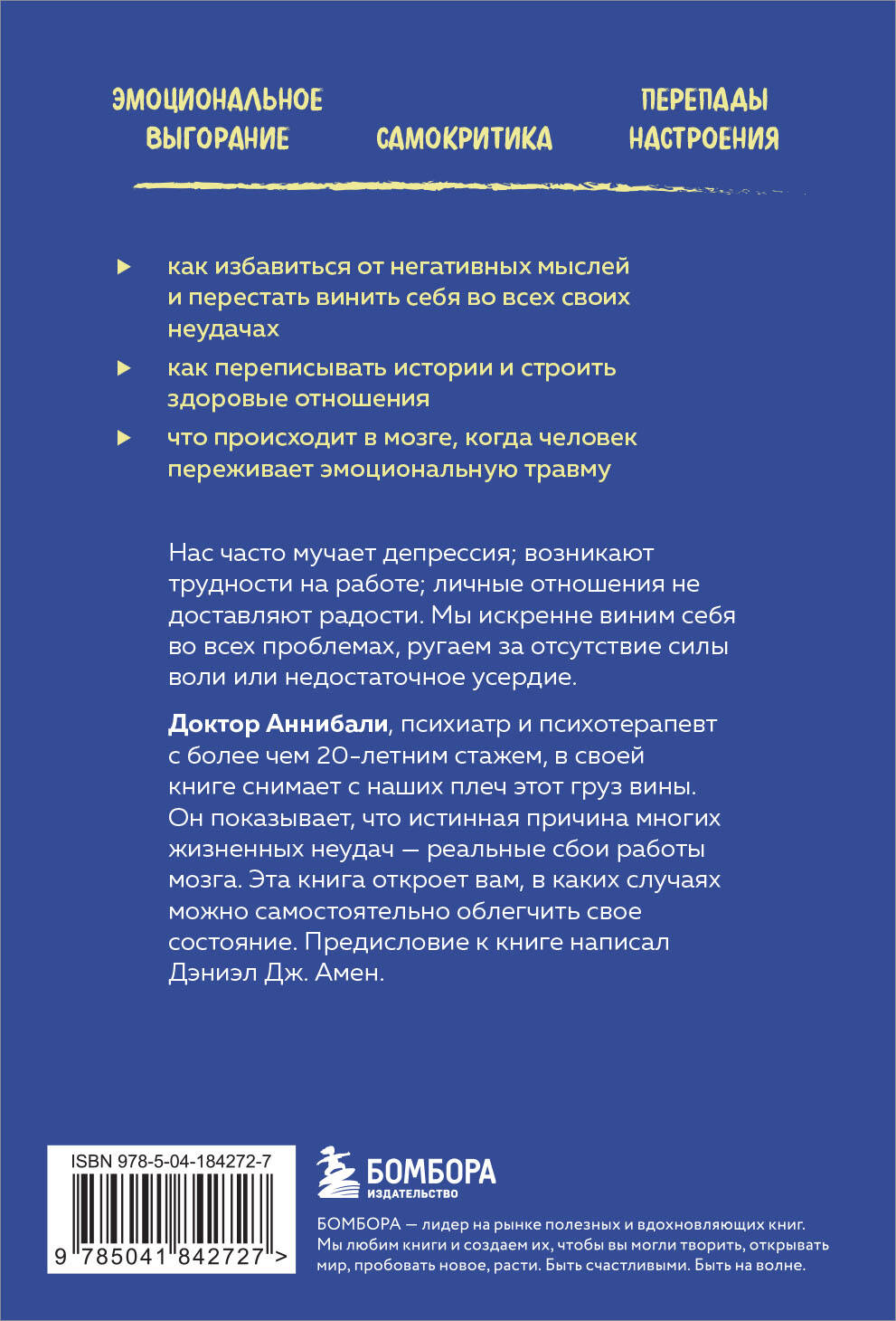 Современному человеку живется нелегко. Его мучает бессонница; он страдает от депрессии; у него трудности на работе; личные отношения отсутствуют или не доставляют радости. Мы искренне виним себя во всех своих проблемах, ругая себя за отсутствие силы воли или недостаточное усердие. Доктор Аннибали, психиатр и психотерапевт с двадцатилетним стажем, в своей книге снимает с наших плеч этот груз вины. Он показывает, что истинная причина многих жизненных неудач - реальные сбои работы мозга. Эта книга откроет вам, в каких случаях можно самостоятельно облегчить свое состояние, а в каких вам может понадобиться врач, чтобы помочь мозгу измениться в лучшую сторону. Предисловие к книге написал Дэниэл Дж. Амен. Из книги вы узнаете: • Как избавиться от негативных мыслей и перестать винить себя во всех своих неудачах. • Как переписывать истории и строить здоровые отношения. • Как справиться с нарушениями работы мозга, которые не позволяют вам быть счастливым и успешным. • Что происходит в мозге, когда человек переживает эмоциональную травму. • Почему депрессия - не блажь и не каприз, а действительно серьезная проблема. Джозеф А. Аннибали - доктор медицинских наук, психоаналитик и ведущий психиатр всемирно известной клиники Амена (Amen Clinics). Доктор Аннибали проводит регулярные семинары, презентации и вебинары по таким темам, как профилактика и лечение синдрома дефицита внимания, лечение тревожности, расстройства настроения, аутизма, болезни Альцгеймера, болезни Лайма и синдрома перегруженного мозга.| Издательство | ООО "Издательство "Эксмо" |