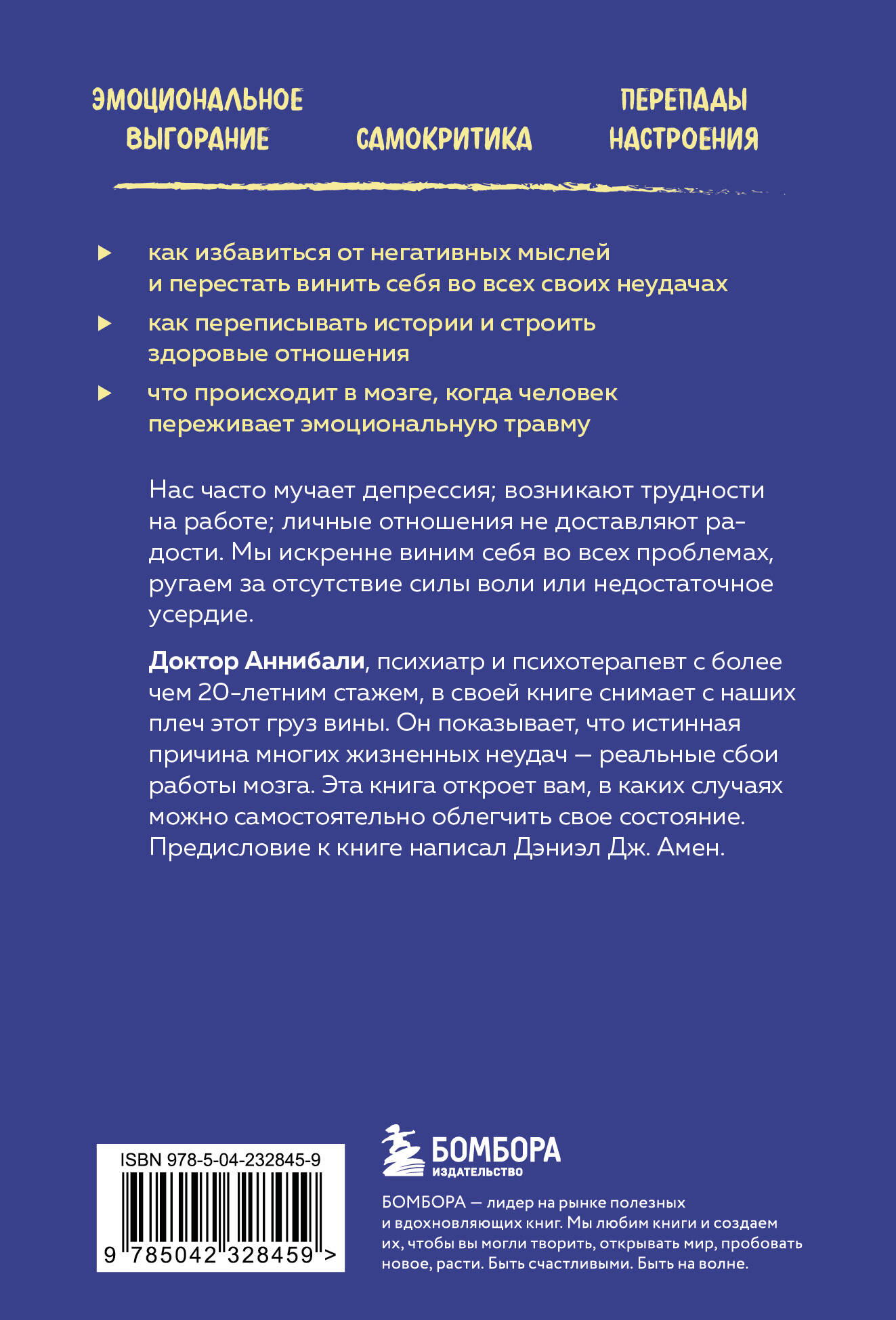 НЕЗАКОННОЕ ПОТРЕБЛЕНИЕ НАРКОТИЧЕСКИХ СРЕДСТВ, ПСИХОТРОПНЫХ ВЕЩЕСТВ, ИХ АНАЛОГОВ ПРИЧИНЯЕТ ВРЕД ЗДОРОВЬЮ, ИХ НЕЗАКОННЫЙ ОБОРОТ ЗАПРЕЩЕН И ВЛЕЧЕТ УСТАНОВЛЕННУЮ ЗАКОНОДАТЕЛЬСТВОМ ОТВЕТСТВЕННОСТЬ. Вы всю жизнь считали себя лентяем, эгоистом, пессимистом или истериком, обвиняя в своих неудачах отсутствие силы воли и желания "быть нормальным"? Доктор Джозеф Аннибали, психиатр и психотерапевт с двадцатилетним стажем, на реальных примерах показывает, что это вовсе не черты характера, а симптомы различных нарушений работы мозга: СДВГ, депрессии, обсессивно-компульсивного, аффективного или биполярного расстройства, последствия эмоциональной травмы. То, что вам действительно необходимо - обуздать свой растревоженный мозг, вернуть его из хаоса в состояние равновесия и покоя. Прочитав книгу, вы узнаете, как вы можете самостоятельно облегчить свое состояние, и чем вам может помочь врач. Вы начнете лучше понимать себя и терпимее относиться к тем людям, чье поведение не укладывается в рамки нормы.| Издательство | ООО "Издательство "Эксмо" |