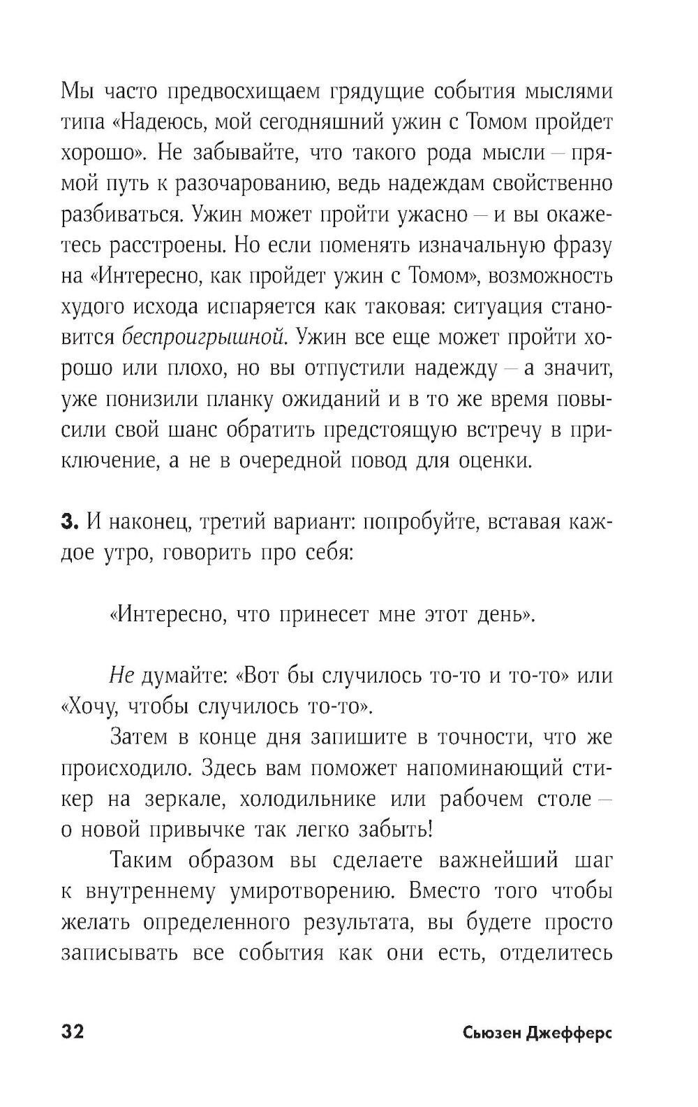 Никто не знает, что произойдет в следующий момент нашей жизни. Единственное, в чем мы можем быть уверены, что все непредсказуемо. Такая постоянная неопределенность вызывает тревогу, становится постоянным источником беспокойства. Что же делать? Автор международного бестселлера «Бойся... но действуй!» Сьюзен Джефферс считает, что жизнь не обязательно должна быть чередой тревог, бесконечным потоком «а что, если» и постоянной попыткой создать для себя надежное убежище. Неопределенность не должна мешать насыщенной и интересной жизни, а свой страх перед завтрашним днем можно трансформировать в приятное волнение перед чем-то новым и интересным. Разработанные автором ментальные практики и упражнения научат вас видеть в каждом событии (как хорошем, так и плохом) возможность для роста и понимания себя; осознанно менять негативное восприятие ситуации на позитивное; избегать чрезмерной зависимости от успехов и отчаяния из-за неудач. Но главное, вы освоите фундаментальный навык, который позволяет встречать будущее не с тревогой, а с готовностью к новым возможностям.| Издательство | Альпина Паблишер |