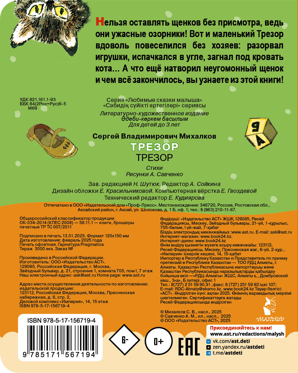 Нельзя оставлять щенков без присмотра, ведь они ужасные озорники! Вот и маленький Трезор вдоволь повеселился без хозяев: разорвал игрушки, испачкался в угле, загнал под кровать кота… А что ещё натворил неугомонный щенок и чем всё закончилось, вы узнаете из этой книги! Сергей Владимирович Михалков - классик отечественной детской литературы. Его стихотворения особенно нравятся маленьким читателям, ведь они веселые, ритмичные и легко запоминаются. А еще в этой книжке каждой фразе из стихотворения соответствует иллюстрация, и историю можно проследить по картинкам. Эта книга предназначена именно для малышей: в ней яркие рисунки и крупные буквы, плотный картон не порвется при чтении, а скругленные уголки не повредят маленькие пальчики| Издательство | Издательство "АСТ" |