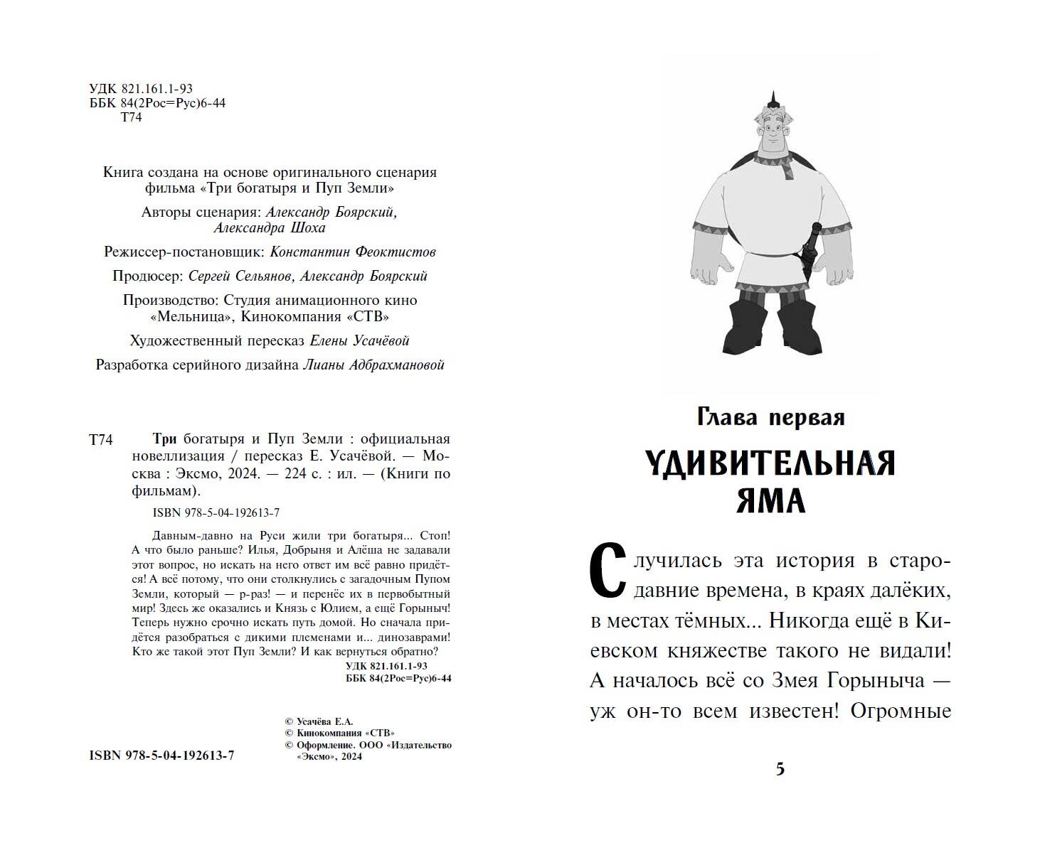 Официальная новеллизация фильма «Три богатыря и Пуп Земли»: новые приключения любимых героев, много юмора, крупный шрифт и цветные вклейки! Игогошеньки, что произошло на Руси! Где ж такое видано, чтобы князь под землю провалился! А вместе с ним и богатыри, и Горыныч, и говорящий конь Юлий! А всему виной таинственный Пуп Земли: и откуда он взялся? Ну, делать нечего: придётся друзьям осваиваться в первобытном мире и искать общий язык с дикарями и… динозаврами! Но главное - это найти путь домой. Ведь там их уже ждут не дождутся родные. Справятся ли Илья, Добрыня и Алёша с новым испытанием? И удастся ли им понять, что же это за Пуп Земли такой?!| Издательство | ООО "Издательство "Эксмо" |