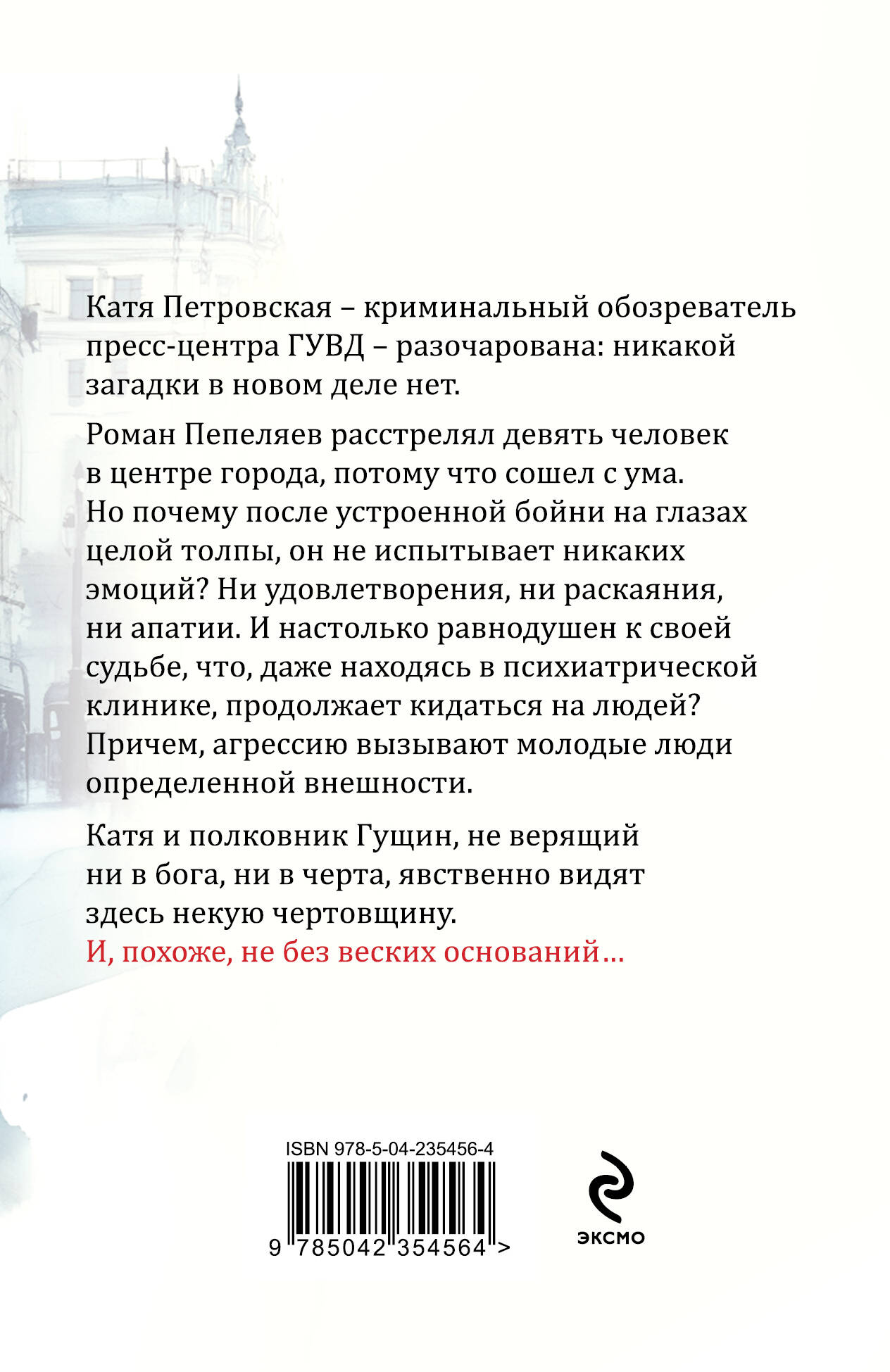 Катя Петровская - криминальный обозреватель пресс-центра ГУВД - разочарована: никакой загадки в новом деле нет. Роман Пепеляев расстрелял девять человек в центре города, потому что сошел с ума. Но почему после устроенной бойни на глазах целой толпы, он не испытывает никаких эмоций? Ни удовлетворения, ни раскаяния, ни апатии. И настолько равнодушен к своей судьбе, что, даже находясь в психиатрической клинике, продолжает кидаться на людей? Причем, агрессию вызывают молодые люди определенной внешности. Катя и полковник Гущин, не верящий ни в бога, ни в черта, явственно видят здесь некую чертовщину. И, похоже, не без веских оснований…| Издательство | ООО "Издательство "Эксмо" |