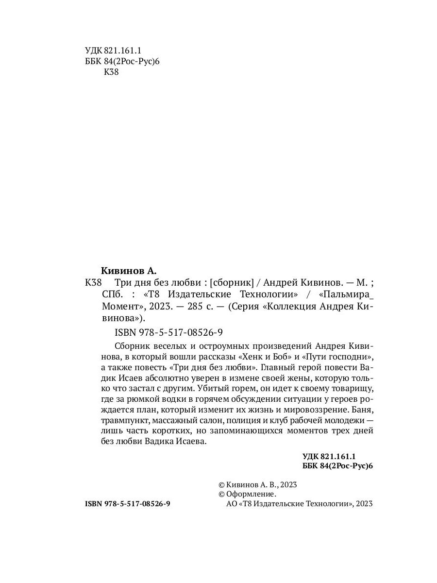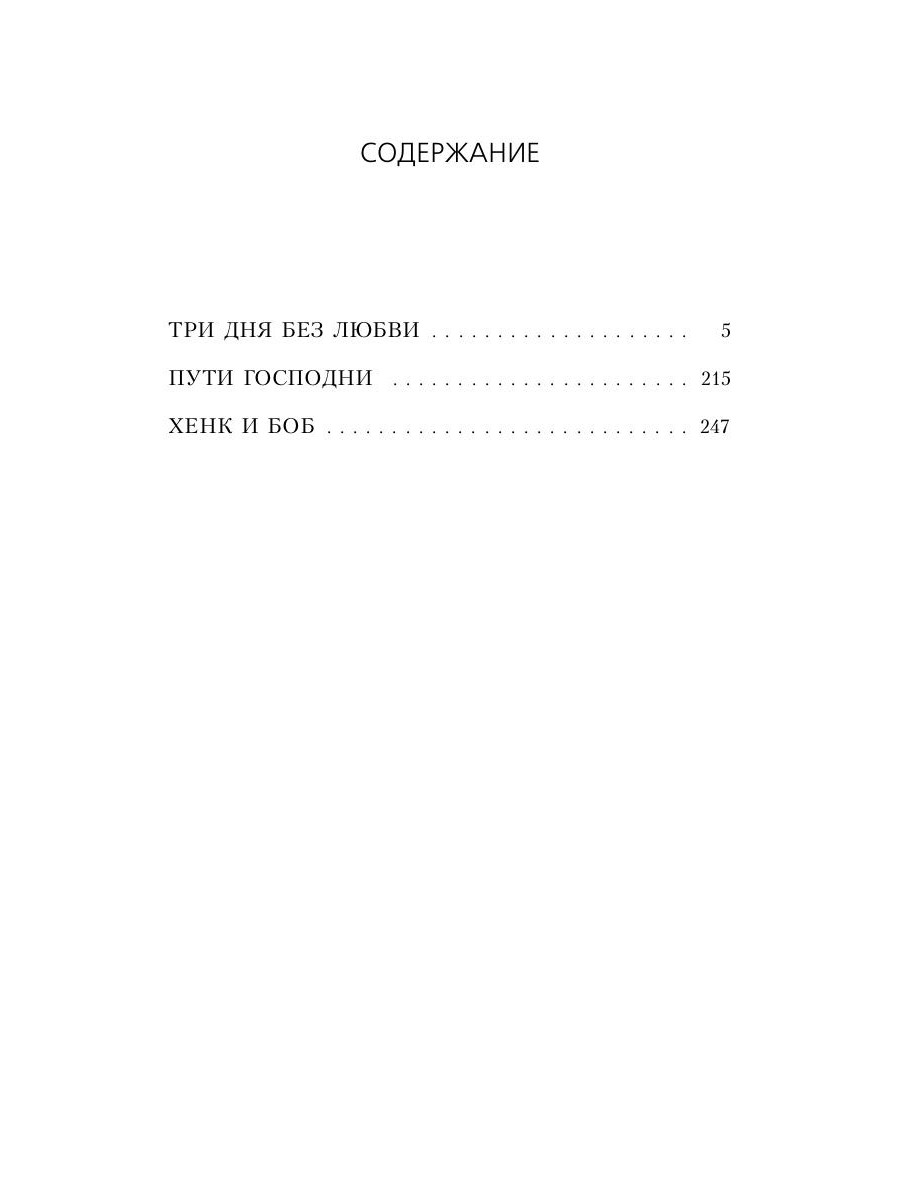 Сборник веселых и остроумных произведений Андрея Кивинова, в который вошли рассказы "Хенк и Боб" и "Пути господни", а также повесть "Три дня без любви". Главный герой повести Вадик Исаев абсолютно уверен в измене своей жены, которую только что застал с другим. Убитый горем, он идет к своему товарищу, где за рюмкой водки в горячем обсуждении ситуации у героев рождается план, который изменит их жизнь и мировоззрение. Баня, травмпункт, массажный салон, полиция и клуб рабочей молодежи - лишь часть коротких, но запоминающихся моментов трех дней без любви Вадика Исаева.| Издательство | Т8 RUGRAM |