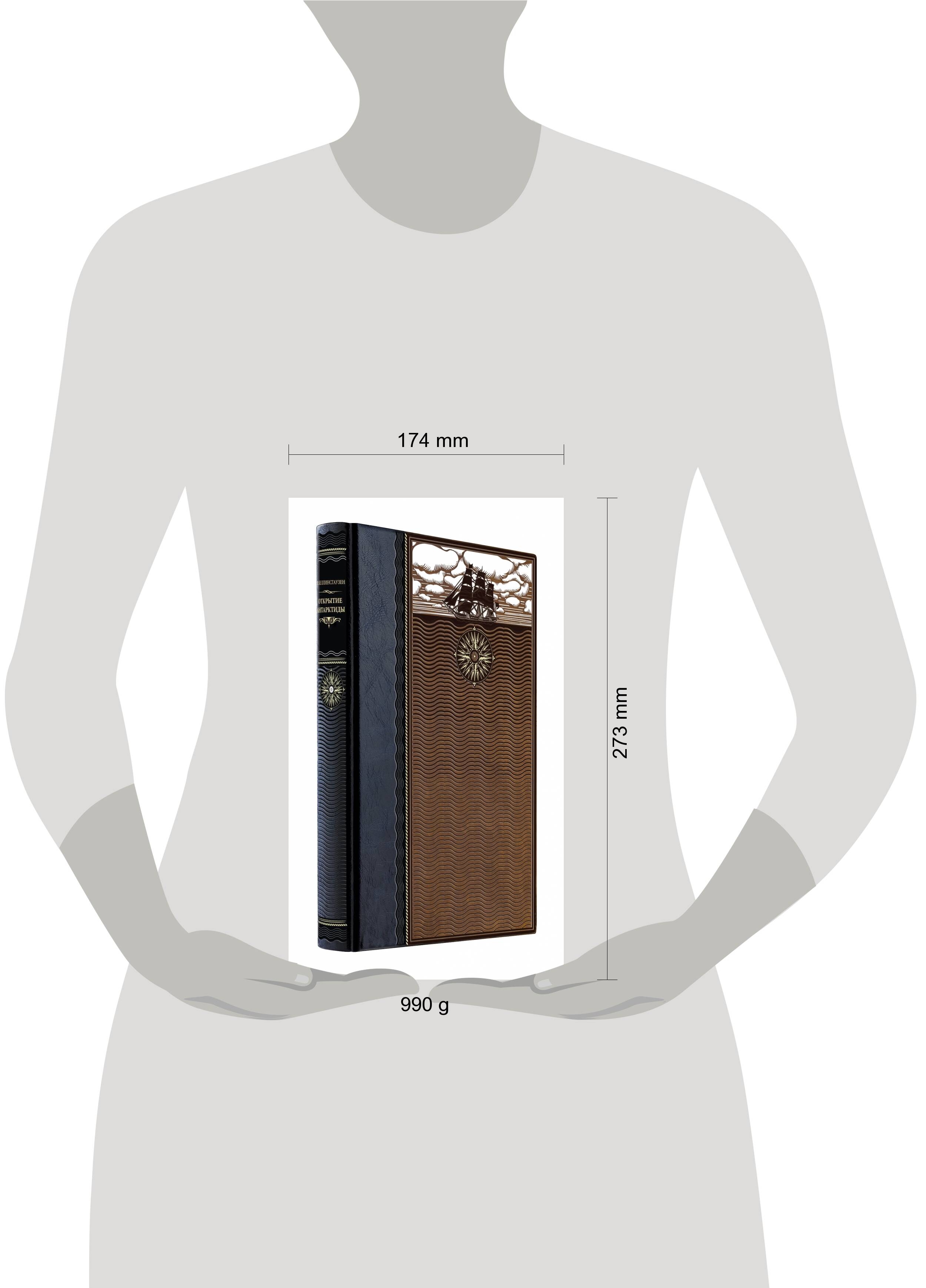 Книга в коллекционном инкрустированном переплете. Переплет изготовлен их двух видов натуральной кожи с естественным рисунком и вариантами оттенков (цвета тёмно-синий и коричневый) по технологии XIX века и украшен сплошным тончайшим тиснением матовым золотом и серебром и рельефным блинтовым тиснением, в полном соответствии с лучшими образцами переплетов европейских мастеров. В оформлении переплета использованы орнаменты и гравированные изображения карт и кораблей, благодаря им книга будет отлично смотреться на любой книжной полке. Форзацы из металлизированной бумаги. Лента для закладывания страниц и каптал, скрепляющий верх и низ объемного тома, изготовлены из шелка. Бумага в книге легкая, матовая, что обеспечивает комфортное чтение даже длительное время, цветные иллюстрации напечатаны на высокобелой мелованной бумаге. Обрез книги окрашен в тёмно-синий цвет, торшонирован и вызолочен вручную. Сертификат, подтверждающий уникальность издания, вшит в книгу и пронумерован вручную. Общий тираж 10 экземпляров.| Издательство | ООО "Издательство "Эксмо" |
