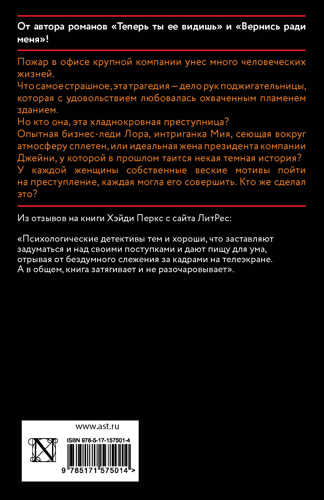 Пожар в офисе крупной компании унес много человеческих жизней. Что самое страшное, эта трагедия - дело рук поджигательницы, которая с удовольствием любовалась охваченным пламенем зданием. Но кто она, эта хладнокровная преступница? Опытная бизнес-леди Лора, интриганка Мия, сеющая вокруг атмосферу сплетен, или идеальная жена президента компании - Джейни, у которой в прошлом таится некая темная история? У каждой женщины - собственные веские мотивы пойти на преступление, каждая могла его совершить. Кто же сделал это?| Издательство | ИЗДАТЕЛЬСТВО "АСТ" |