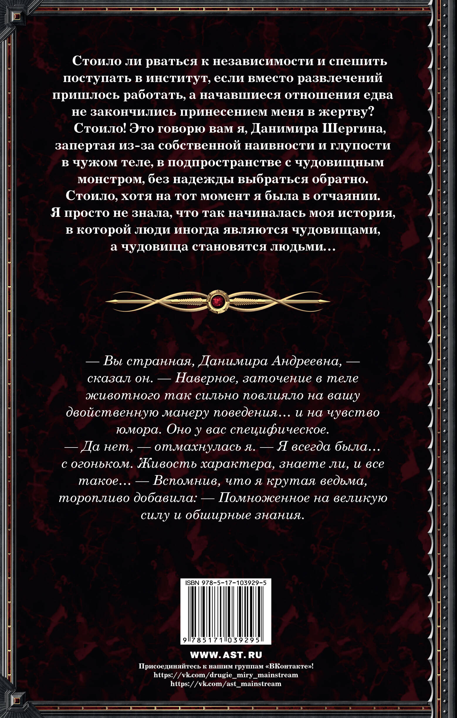 Стоило ли рваться к независимости и спешить поступать в институт, если вместо развлечений пришлось работать, а начавшиеся отношения едва не закончились принесением меня в жертву? Стоило! Это говорю вам я, Данимира Шергина, запертая из-за собственной наивности и глупости в чужом теле, в подпространстве с чудовищным монстром, без надежды выбраться обратно. Стоило, хотя на тот момент я была в отчаянии. Я просто не знала, что так начиналась моя история, в которой люди иногда являются чудовищами, а чудовища становятся людьми…| Издательство | ИЗДАТЕЛЬСТВО "АСТ" |