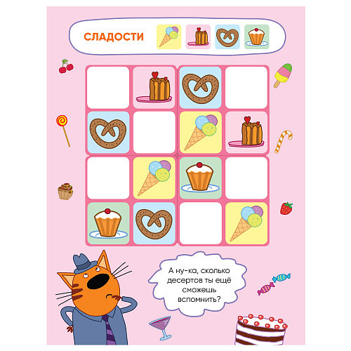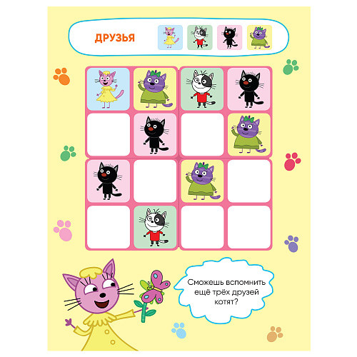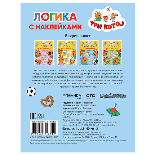 В серии «Три кота. Логика с наклейками» наклейки становятся не только развлечением, но и отличным инструментом для развития логики и мышления. В книжке «Судоку» ребят ждут адаптированная версия популярной головоломки и 60 многоразовых наклеек. Герои суперпопулярного мультфильма «Три кота» помогут разгадать головоломки, а также зададут вопросы на развитие кругозора. А ещё эту книжку удобно брать с собой - она легко поместится даже в детский рюкзачок и поможет с пользой провести время вместе с любимыми героями.