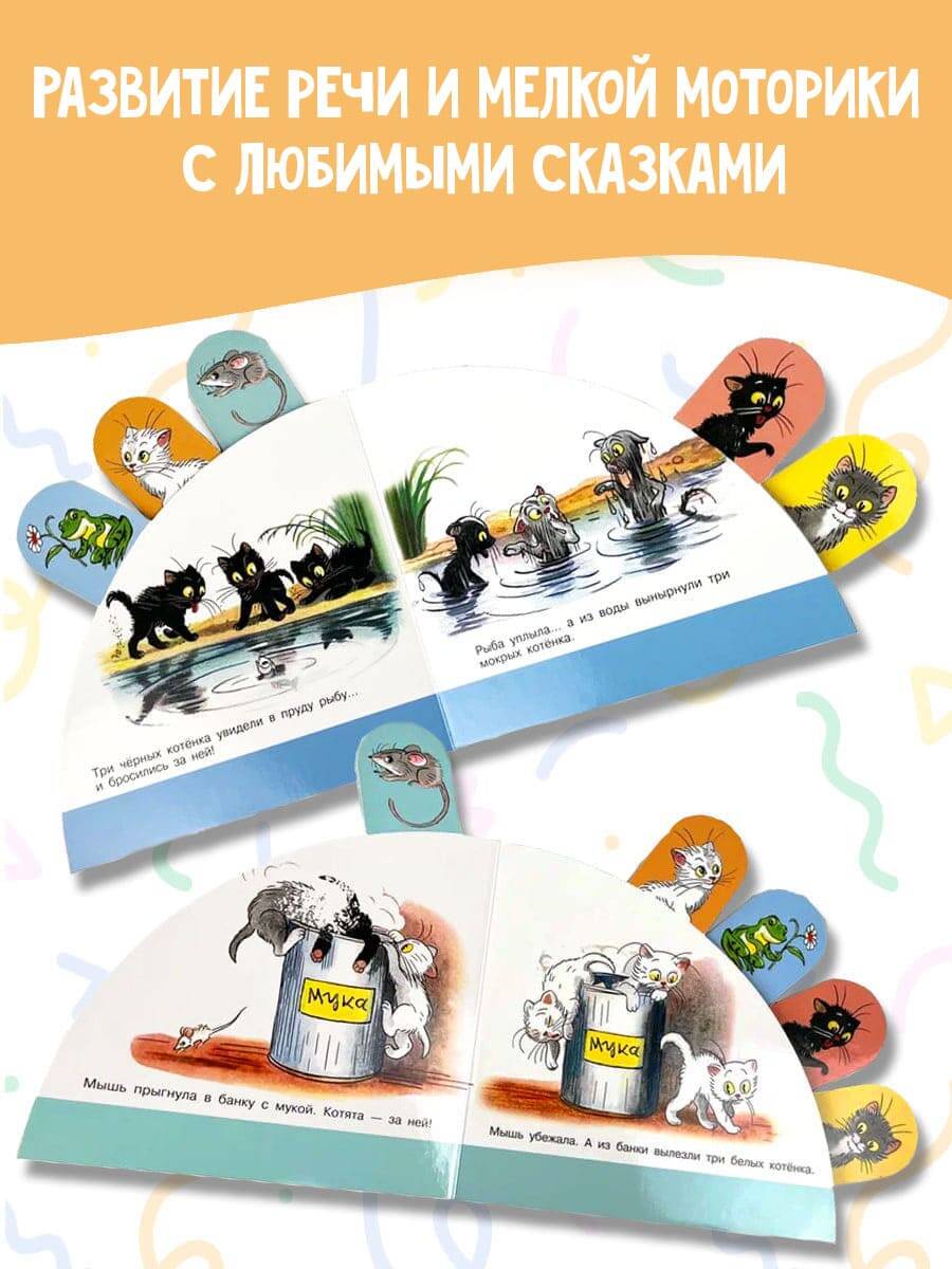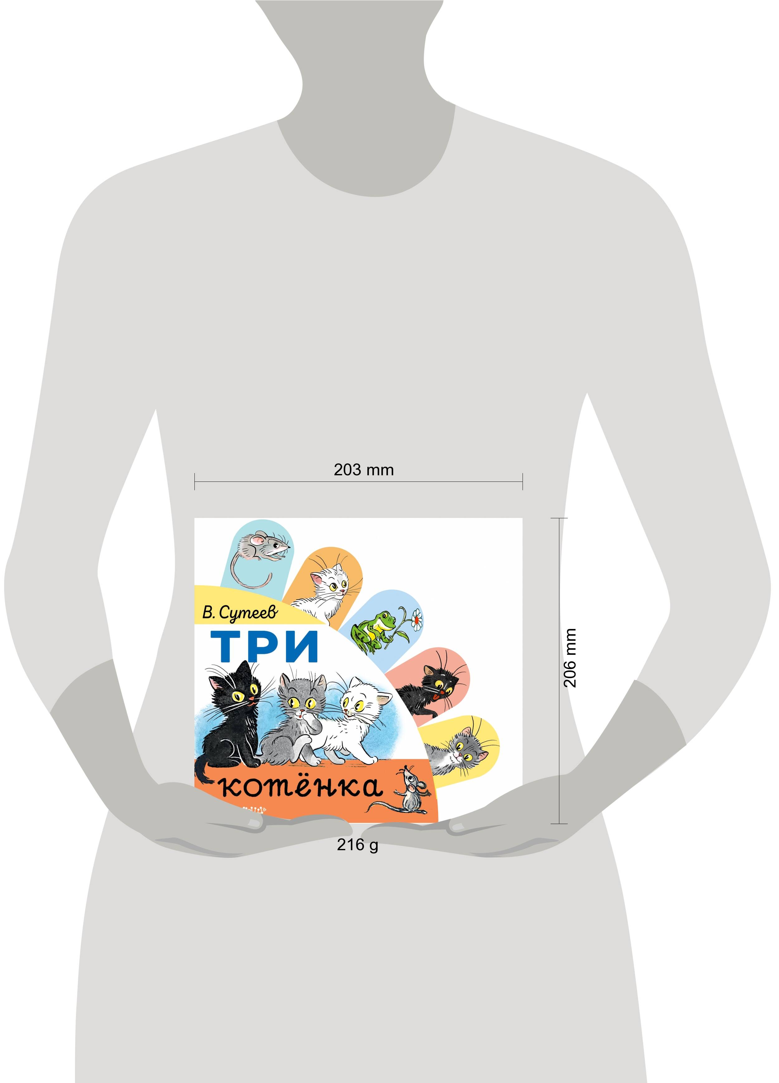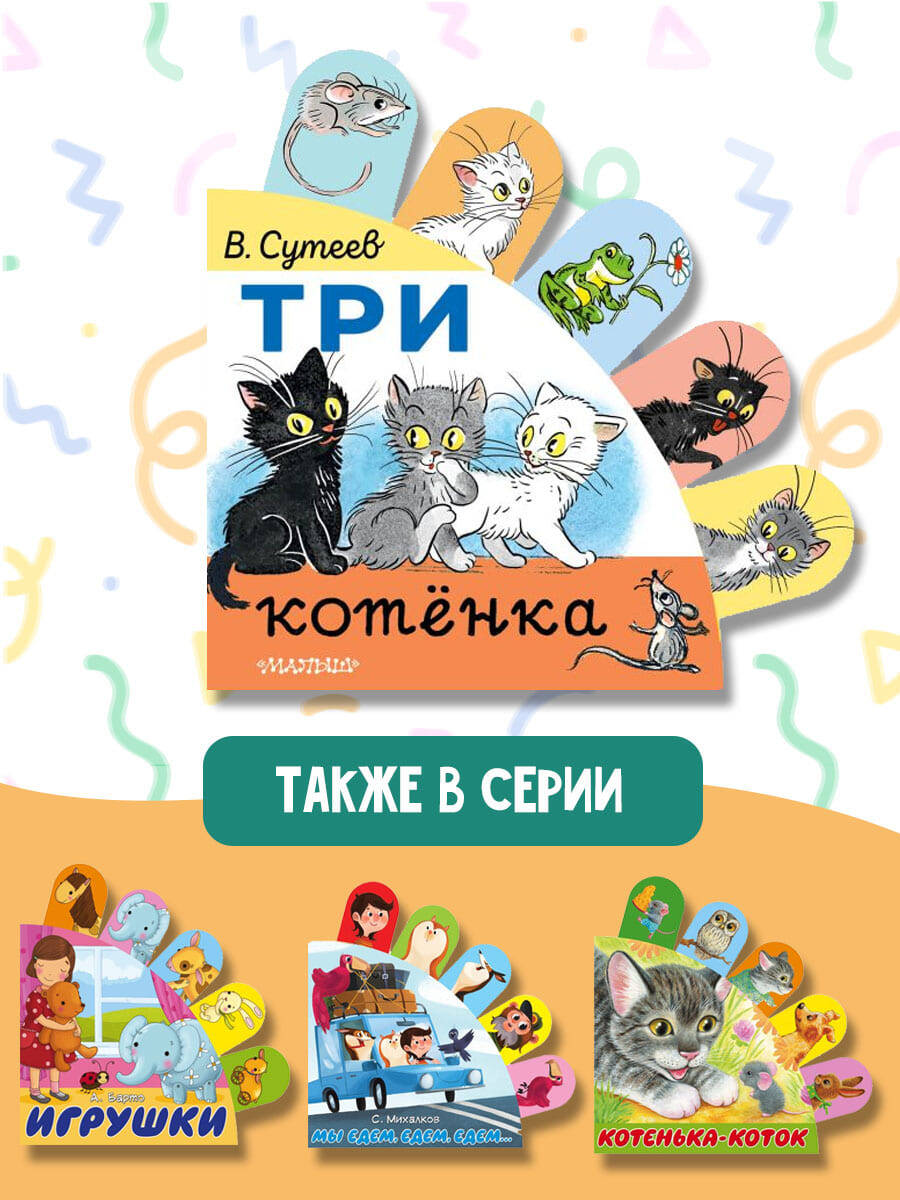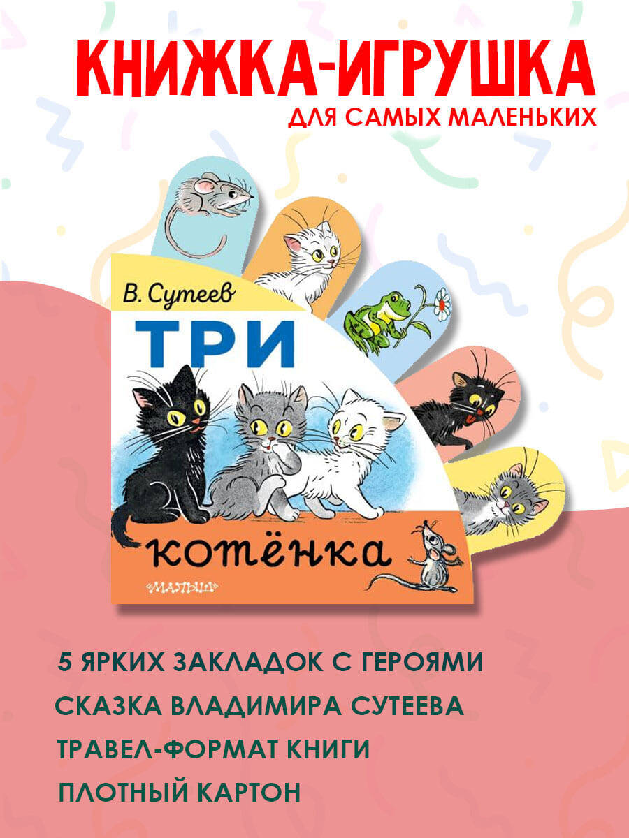 Три котёнка, чёрный, серый и белый, - три лучших друга. Они всё делают вместе: играют, гуляют и шалят. В нашей книге - короткая сказка знаменитого писателя, художника-иллюстратора В. Сутеева. Он не только сам сочинил забавную историю про котят, но и нарисовал к ней замечательные картинки. А ещё это книжка-игрушка для самых маленьких. Герои книги вынесены на специальные закладки, которые помогут акцентировать внимание ребёнка, а также помогут ему развить мелкую моторику. Малыш послушает сказку, внимательно рассмотрит картинки, а затем назовёт её персонажей с помощью наших весёлых закладок.| Издательство | ИЗДАТЕЛЬСТВО "АСТ" |