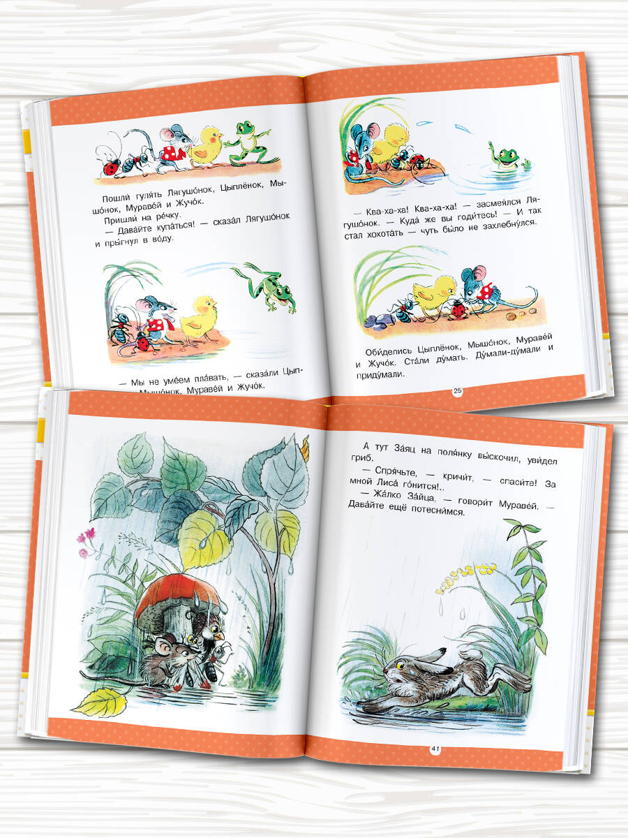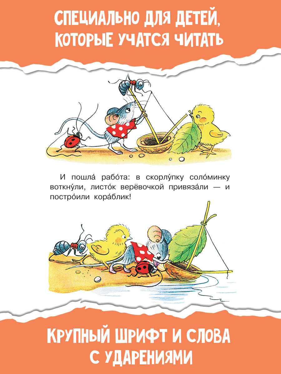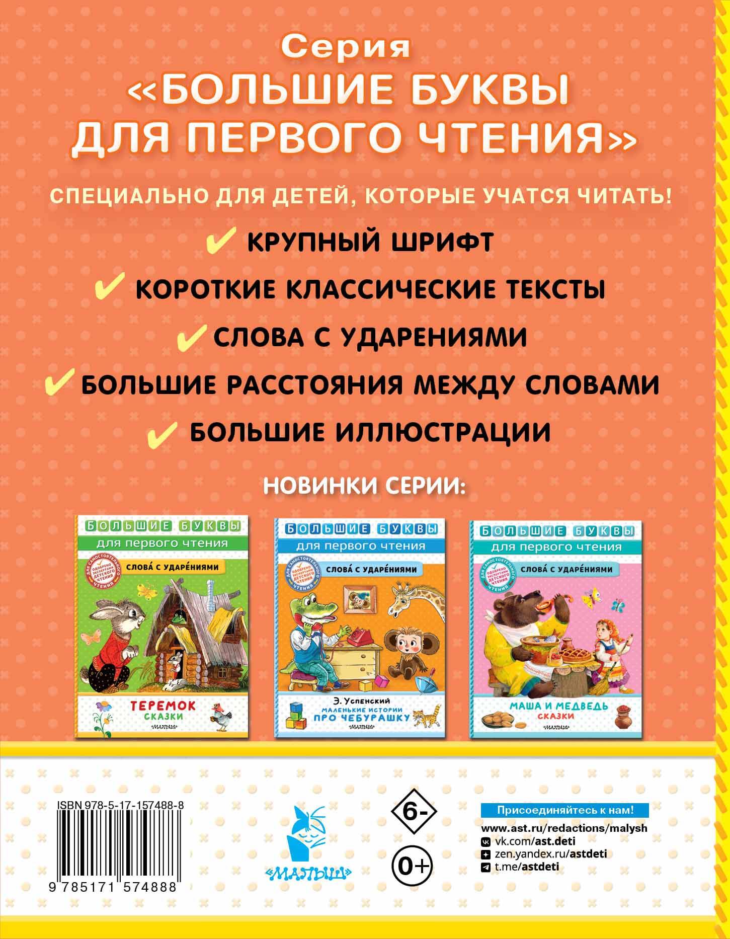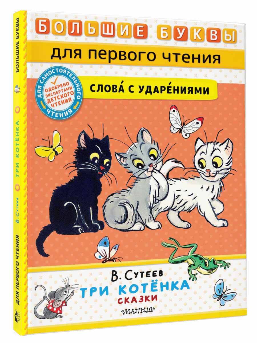 СЕРИЯ "Большие буквы для первого чтения": CПЕЦИАЛЬНО ДЛЯ ДЕТЕЙ, КОТОРЫЕ УЧАТСЯ ЧИТАТЬ! КРУПНЫЙ ШРИФТ КОРОТКИЕ КЛАССИЧЕСКИЕ ТЕКСТЫ СЛОВА С УДАРЕНИЯМИ БОЛЬШИЕ РАССТОЯНИЯ МЕЖДУ СЛОВАМИ БОЛЬШИЕ ИЛЛЮСТРАЦИИ В нашей книге известного талантливого автора-художника и мультипликатора В. Сутеева маленькие сказочные истории для малышей. Все они давно стали знаменитыми сказками и мультфильмами. Это «Три котёнка», «Цыплёнок и Утёнок», «Кораблик» и «Под грибом». Сказки совсем небольшие, поэтому они отлично подходят для первого самостоятельного чтения. В книге большой шрифт и слова с ударениями.| Издательство | Издательство "АСТ" |