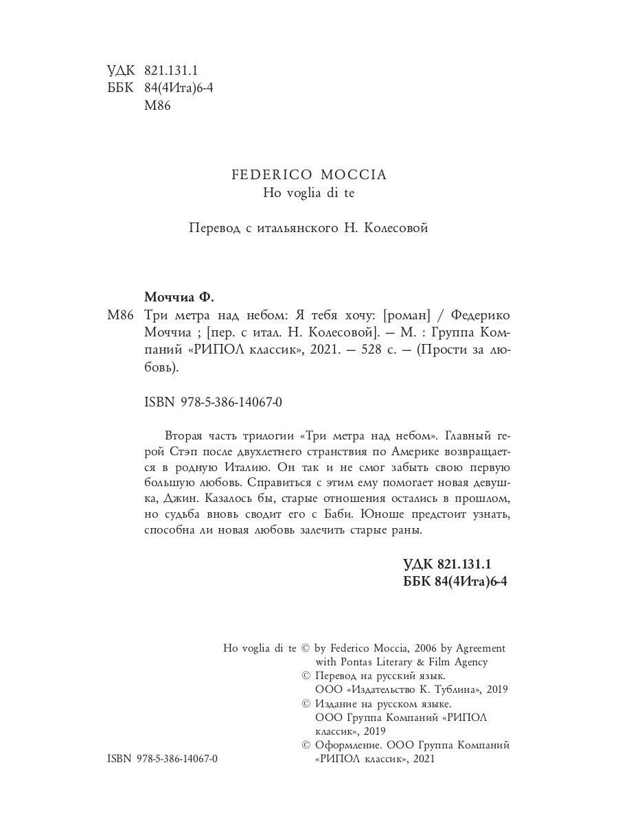 Эта книга продолжение знаменитого романа «Три метра над небом» Федерико Моччиа. Главный герой Стэп после двухлетнего странствия по Америке возвращается в родную Италию. Так и не забыв Баби, Стэп постоянно мыслями возвращается в прошлое. Справиться с этим ему помогает новая девушка Джин. Казалось бы, старые отношения остались в прошлом, но судьба вновь его сводит с Баби. Проходят ли былые чувства или новая любовь способна залечить старые раны. Все это предстоит узнать главному герою романа.| Издательство | Рипол Классик |