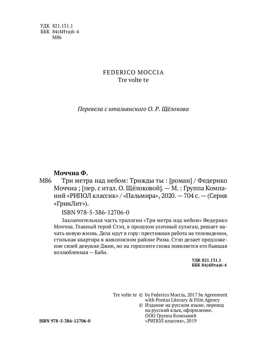 Заключительная часть трилогии «Три метра над небом» Федерико Моччиа. Главный герой Стэп, в прошлом уличный хулиган, решает начать новую жизнь. Дела идут в гору: престижная работа на телевидении, стильная квартира в живописном районе Рима. Стэп делает предложение своей девушке Джин, но на горизонте снова появляется его бывшая возлюбленная - Баби.| Издательство | Рипол Классик |