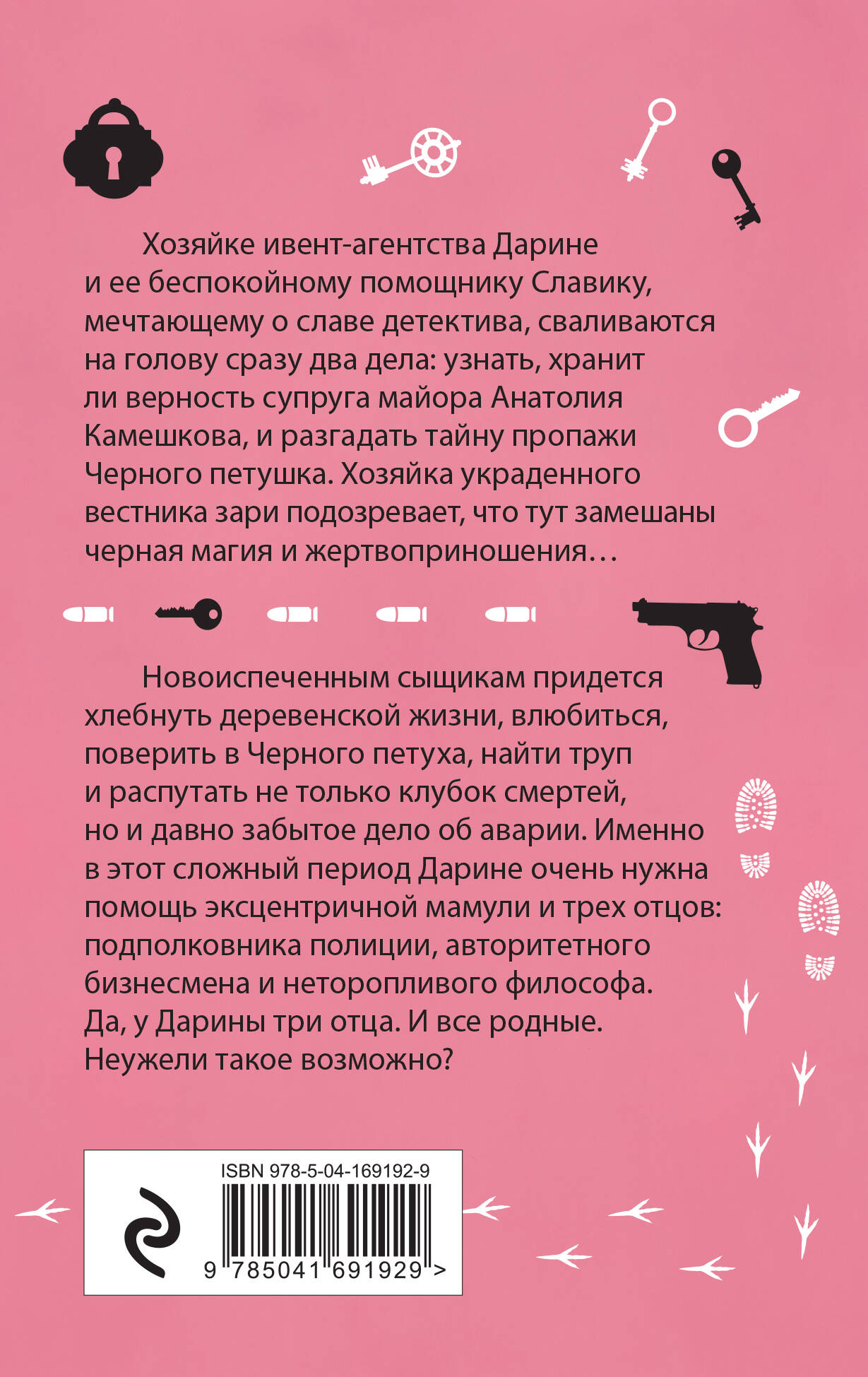 Хозяйке ивент-агентства Дарине и ее беспокойному помощнику Славику, мечтающему о славе детектива, сваливаются на голову сразу два дела: узнать, хранит ли верность супруга майора Анатолия Камешкова, и разгадать тайну пропажи черного петушка. Новоиспеченным сыщикам придется хлебнуть деревенской жизни, влюбиться, поверить в Черного вестника зари, найти труп и распутать не только клубок смертей, но и давно забытое дело об аварии. Именно в этот сложный период Дарине очень нужна помощь эксцентричной мамули и трех отцов: подполковника полиции, авторитетного бизнесмена и неторопливого философа. Да, у Дарины три отца. И все родные. Неужели такое возможно?| Издательство | Эксмо |