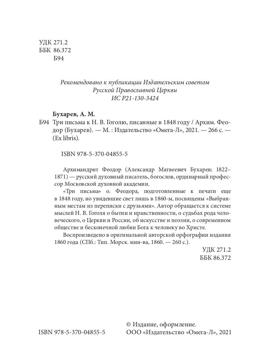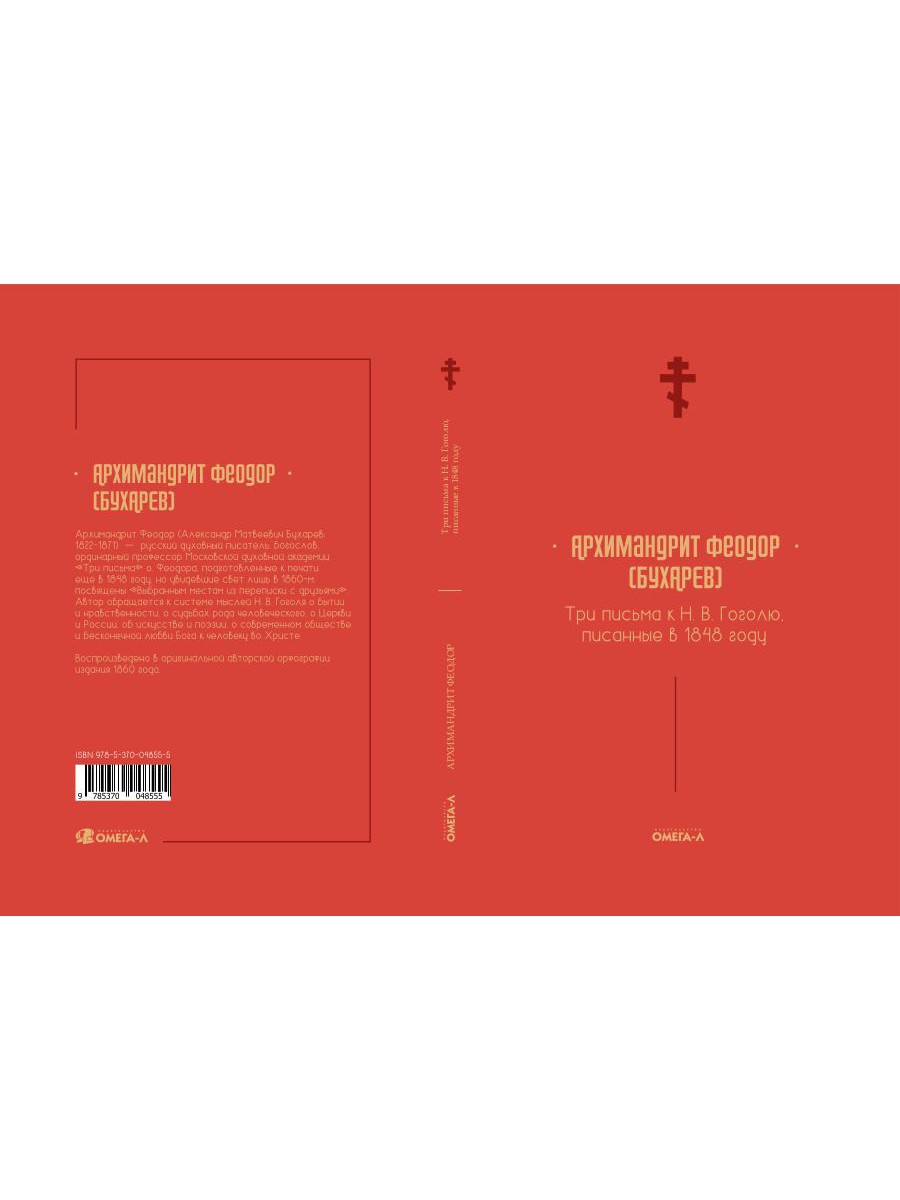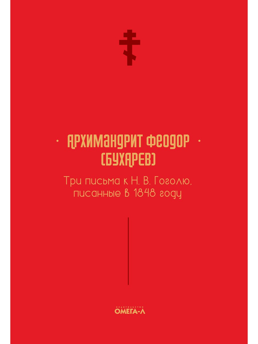 Архимандрит Феодор (Александр Матвеевич Бухарев; 1822-1871) - русский духовный писатель, богослов, ординарный профессор Московской духовной академии. «Три письма» о. Феодора, подготовленные к печати еще в 1848 году, но увидевшие свет лишь в 1860-м, посвящены «Выбранным местам из переписки с друзьями». Автор обращается к системе мыслей Н. В. Гоголя о бытии и нравственности, о судьбах рода человеческого, о Церкви и России, об искусстве и поэзии, о современном обществе и бесконечной любви Бога к человеку во Христе. Воспроизведено в оригинальной авторской орфографии издания 1860 года (СПб.: Тип. Морск. мин-ва, 1860. - 260 с.).| Издательство | Омега-Л |