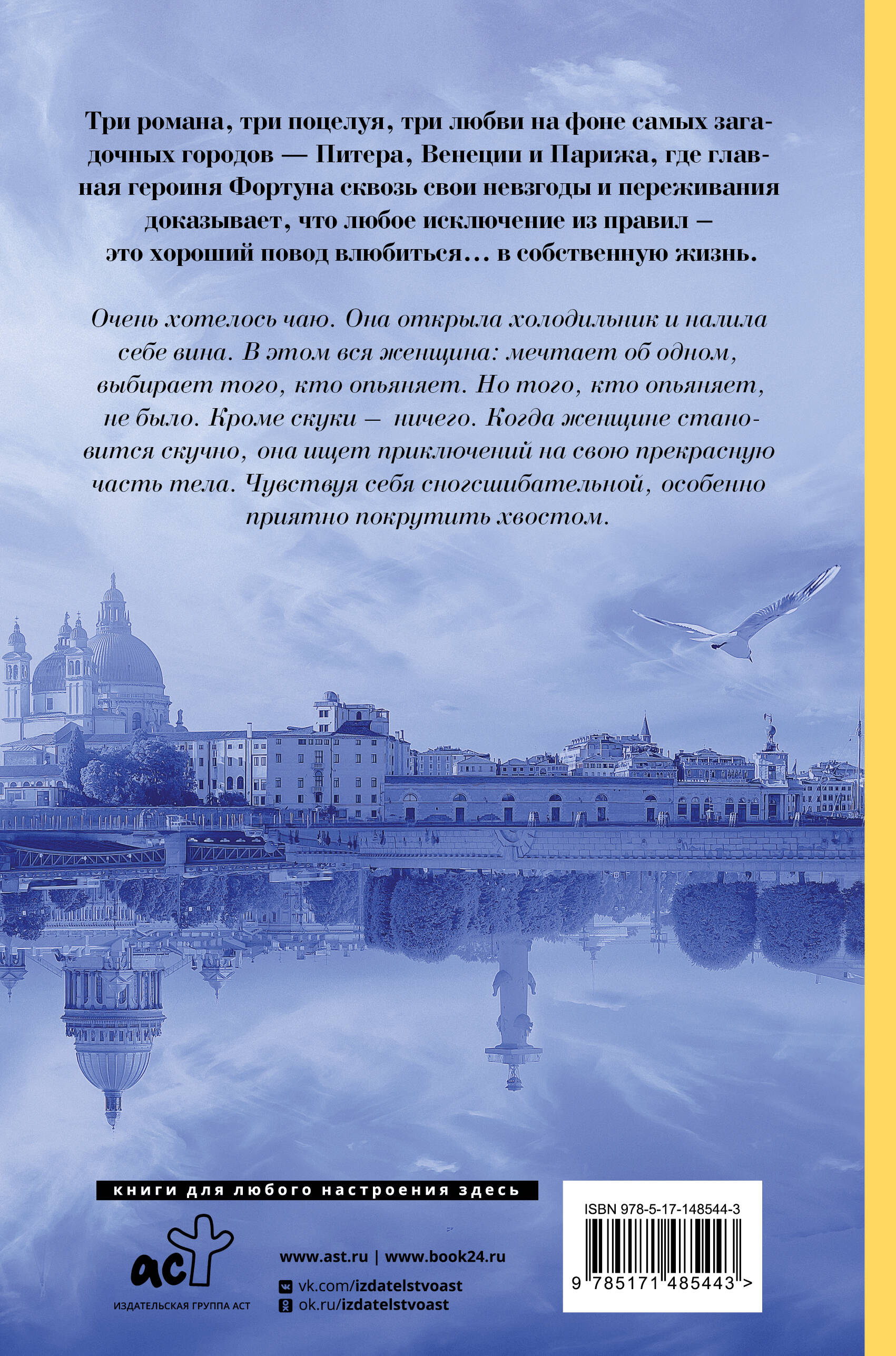 Очень хотелось чаю. Она открыла холодильник и налила себе вина. В этом вся женщина: мечтает об одном, выбирает того, кто опьяняет. Но того, кто опьяняет, не было. Кроме скуки - ничего. Когда женщине становится скучно, она ищет приключений на свою прекрасную часть тела. Чувствуя себя сногсшибательной, особенно приятно покрутить хвостом. Три романа, три поцелуя, три любви на фоне самых загадочных городов Питера, Венеции и Парижа, где главная героиня Фортуна, сквозь свои невзгоды и переживания доказывает, что любое исключение из правил - это хороший повод влюбиться… в собственную жизнь. Художественное оформление - Екатерина Ферез. В книге использованы иллюстрации художницы Натальи Трипольской.| Издательство | ИЗДАТЕЛЬСТВО "АСТ" |