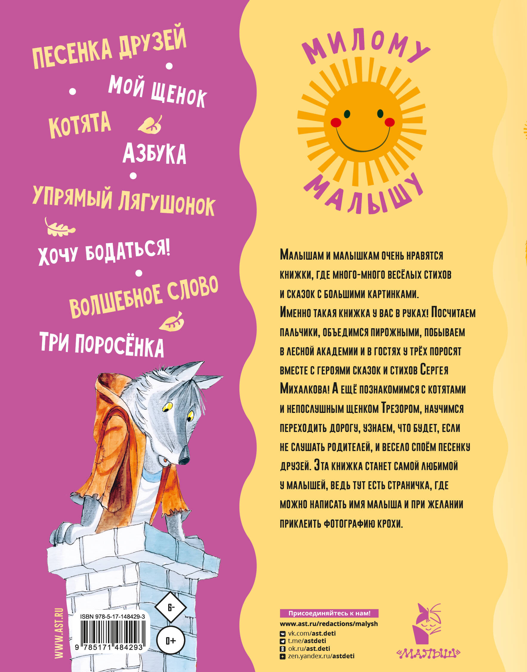 В книгу "Три поросёнка. Сказки и стихи" вошли самые знаменитые произведения для малышей классика детской литературы Сергея Михалкова. В сборник вошли стихотворения, песенки, считалочки, азбуки, сказки о зверятах и ребятах, которые веселятся, капризничают, играют, учат буквы и цифры, то есть ведут себя, как наши любимые милые малыши и малышки. Прочитайте вместе с ними "Песенку друзей", "Трезора", "Про девочку, которая плохо кушала…", "Мою улицу", "Упрямого Козлёнка", "Трёх поросят" и другие произведения, входящие в программы дошкольного чтения. В начале книги есть специальная страничка, где можно написать имя малыша и при желании приклеить фотографию милого крохи! Для дошкольного чтения.| Издательство | АСТ |