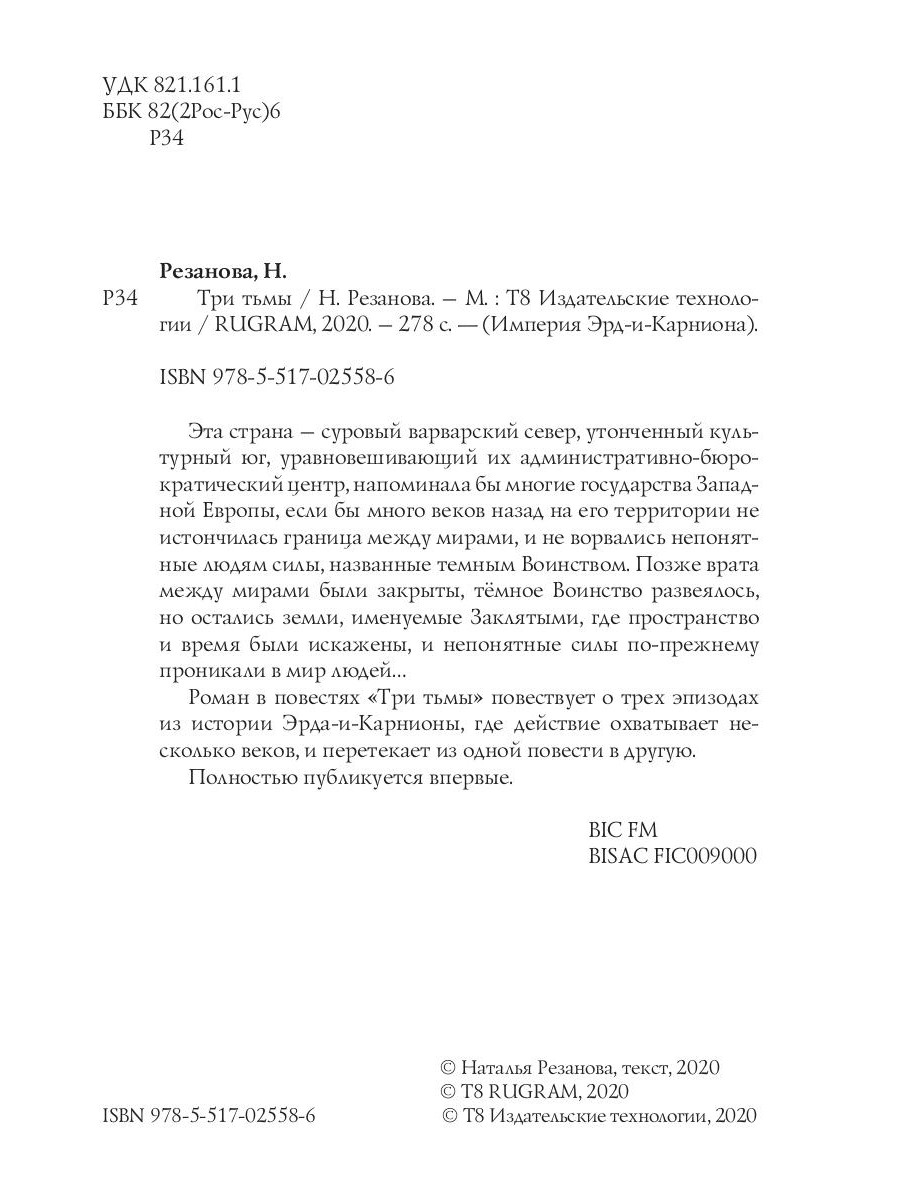 Эта страна - суровый варварский север, утонченный культурный юг, уравновешивающий их административно-бюрократический центр, напоминала бы многие государства Западной Европы, если бы много веков назад на его территории не истончилась граница между мирами, и не ворвались непонятные людям силы, названные темным Воинством. Позже врата между мирами были закрыты, тёмное Воинство развеялось, но остались земли, именуемые Заклятыми, где пространство и время были искажены, и непонятные силы по-прежнему проникали в мир людей... Роман в повестях «Три тьмы» повествует о трех эпизодах из истории Эрда-и-Карнионы, где действие охватывает несколько веков, и перетекает из одной повести в другую. Полностью публикуется впервые.| Издательство | Т8 RUGRAM |