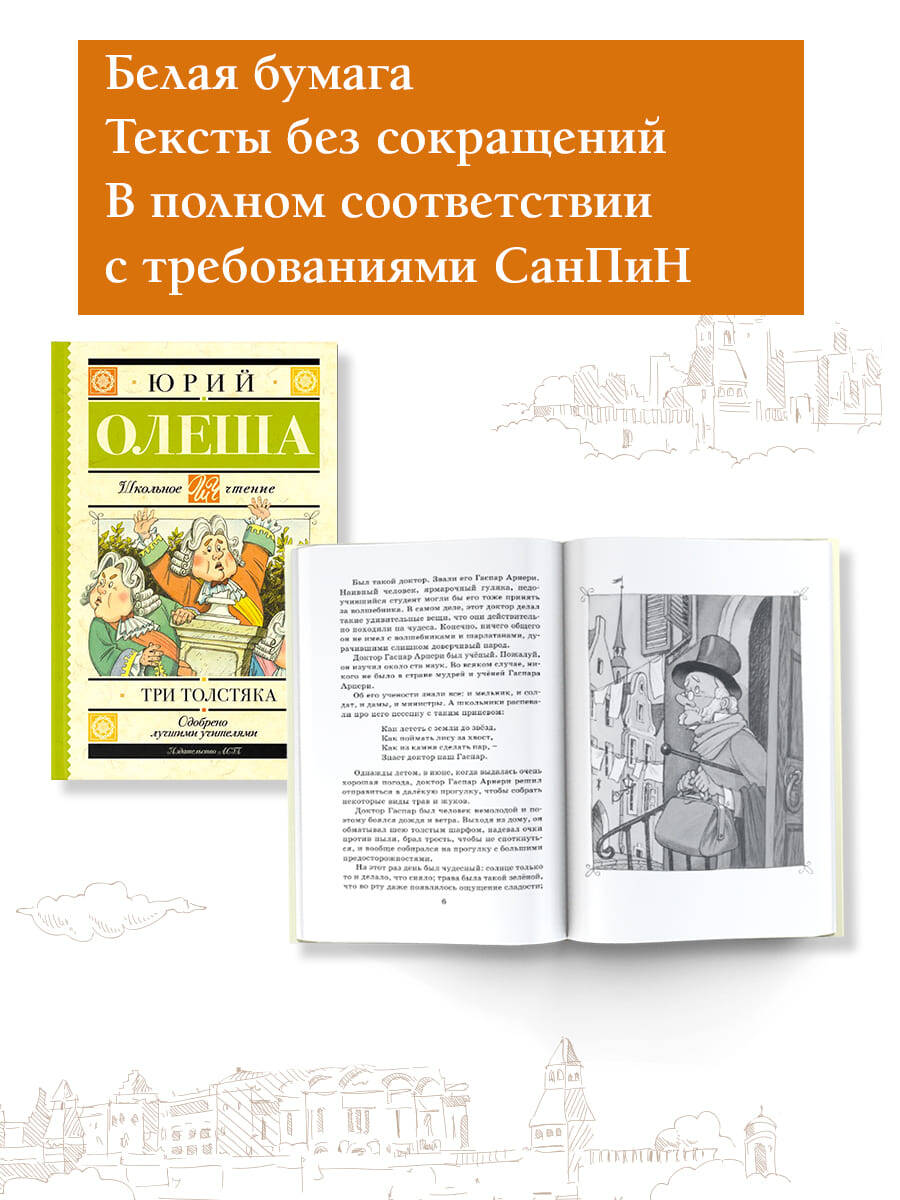"Три толстяка" - самая известная сказочная повесть, написанная Юрием Карловичем Олешей в 1924 году. В ней нет чудес, которые бы не случались в жизни, нет сверхъестественных существ и волшебных предметов. Зато есть отважный канатоходец Тибул, бесстрашная девочка Суок, добрый доктор Гаспар и гордый оружейник Просперо. Вместе они способны на настоящие чудеса. Для младшего школьного возраста.| Издательство | ИЗДАТЕЛЬСТВО "АСТ" |