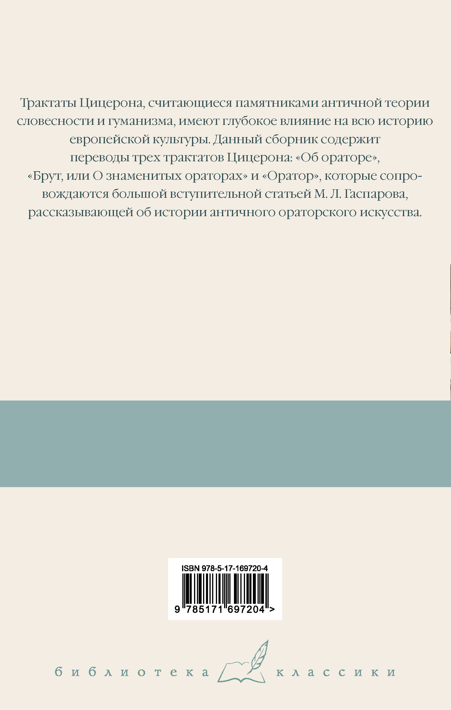 - Трактаты Марка Туллия Цицерона - памятник античной словесности, оказавший огромное влияние на всю европейскую культуру. - В данный сборник вошли три трактата Цицерона - «Об ораторе», «Брут, или О знаменитых ораторах» и «Оратор» - объединенные темой оратора, законченного выражения человеческого идеала высочайшей поры античности. - Издание сопровождается большой вступительной статьей выдающегося российского филолога, литературоведа и теоретика литературы Михаила Леоновича Гаспарова, в которой рассказывается об истории античного ораторского искусства.| Издательство | Издательство "АСТ" |
