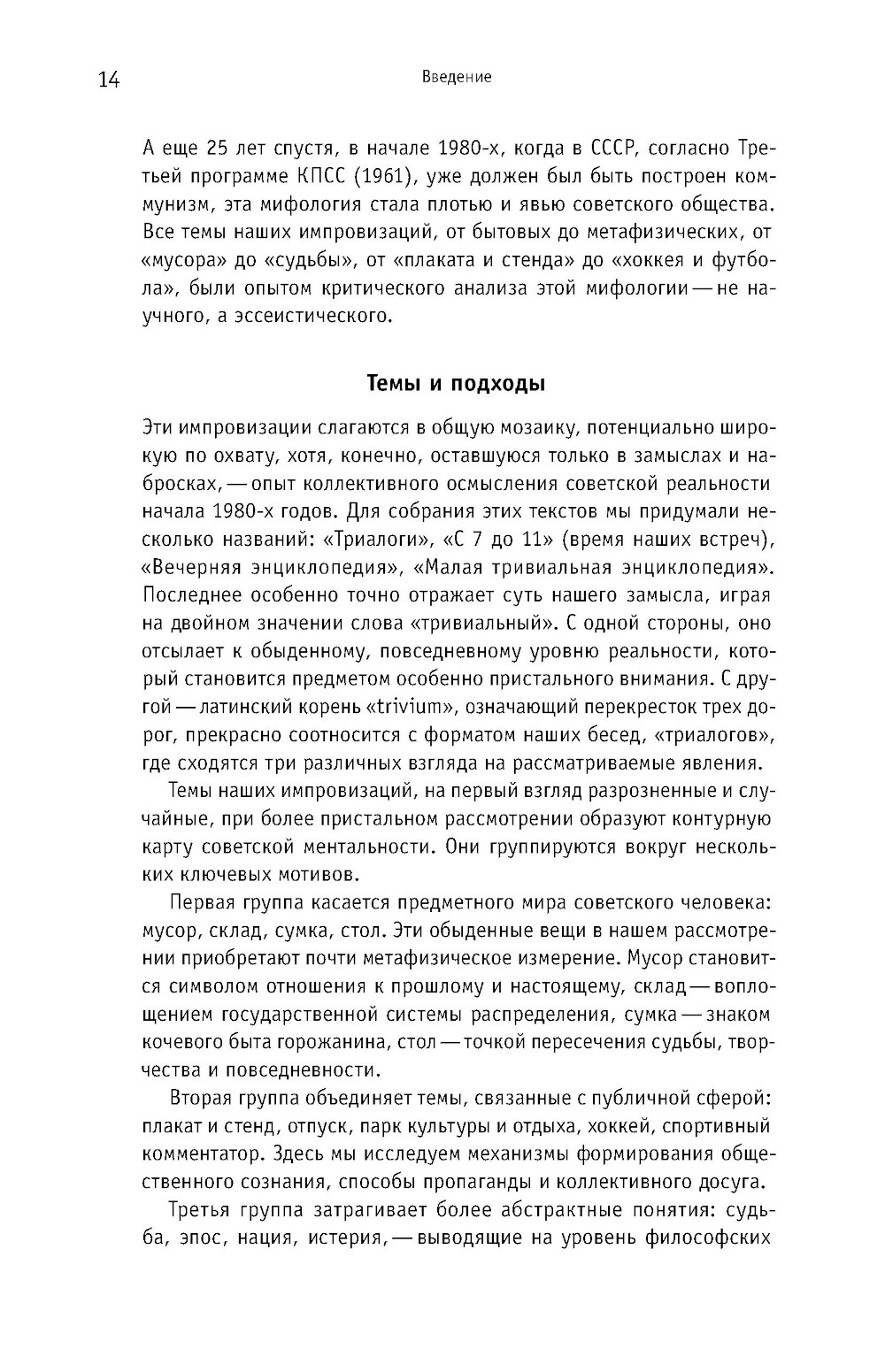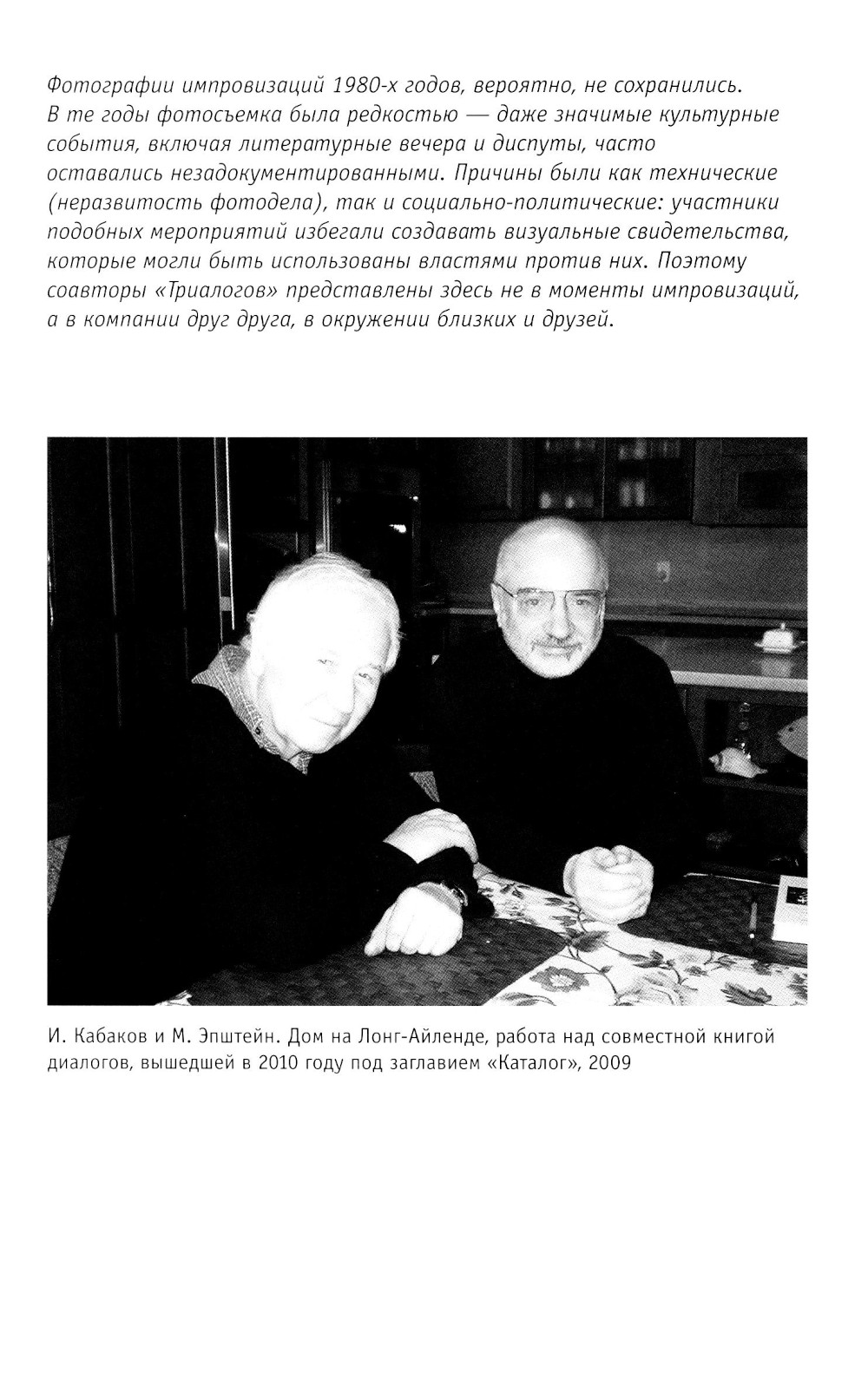 Триалоги - это уникальный творческий эксперимент, который в 1982-1983 годах поставили художник и эссеист Илья Кабаков, искусствовед и социолог Иосиф Бакштейн, а также филолог и культуролог Михаил Эпштейн. На протяжении года они встречались и писали небольшие эссе на выбранные ими темы, а затем обсуждали их и дополняли тексты друг друга комментариями. Темы для этих импровизаций охватывали искусство, культуру, общество и повседневную жизнь; часто предметом совместных дискуссий становились реалии советского времени и важные идеологемы: от хоккея, сумки или плаката до судьбы и эпоса. Помимо материалов импровизационных сессий, в книгу вошел написанный М. Эпштейном раздел «К истории и теории импровизаций», в котором рассказывается о других импровизационных сообществах, возникших в России и на Западе с 1980-х годов до наших дней - Клубе эссеистов, «Египетских ночах», «Пишу как дышу», «Lost and Found». В этом разделе автор рассматривает жанровые особенности импровизации как экзистенциального события мышления, соединение в ней творческой и коммуникативной составляющих, соотношение ее с фольклором и эссеистикой. В приложение включена статья М. Эпштейна «Илья Кабаков как мыслитель», в конце книги приводится библиография работ по проблематике книги, а также хронология всех импровизаций на русском и английском языках, в которых М. Эпштейн участвовал как модератор и автор. Издание иллюстрировано факсимиле текстов И. Кабакова и репродукциями его работ, относящихся к темам импровизаций.| Издательство | Новое литературное обозрение |