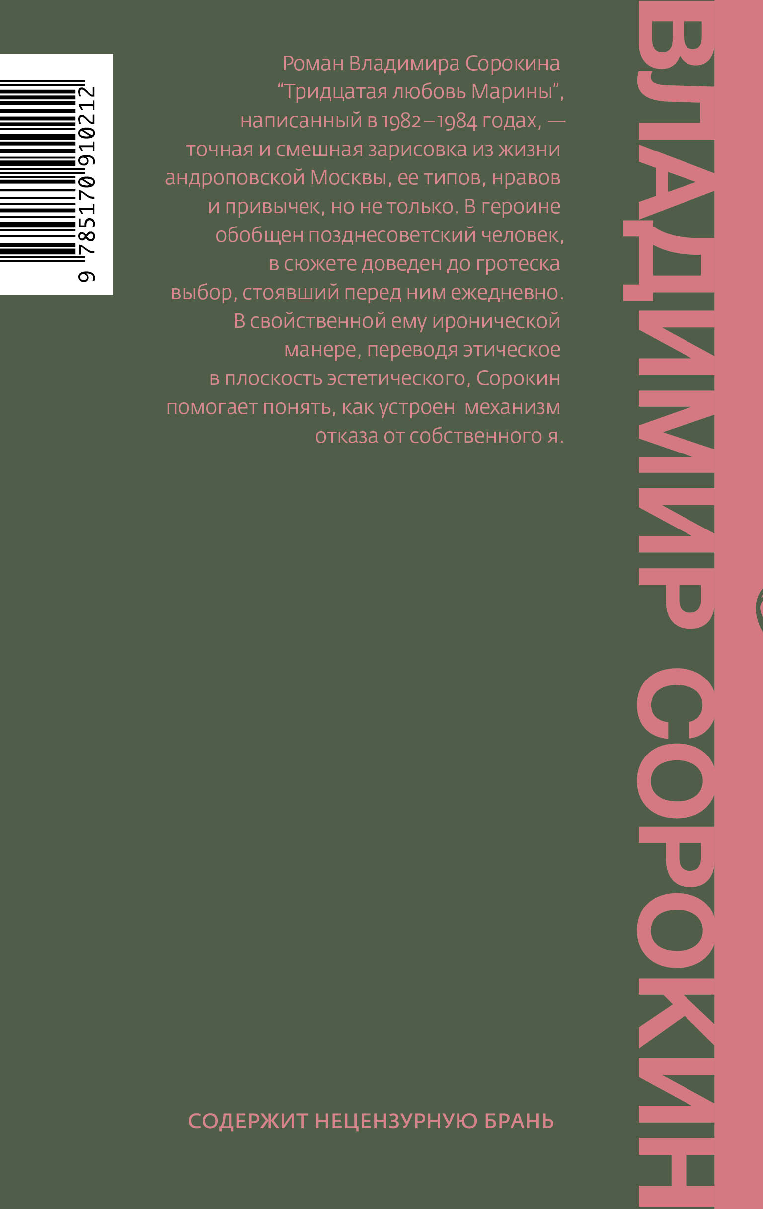 Владимир Сорокин - автор, который не нуждается в представлении. Каждая его книга непременно вызывает самую бурную общественную реакцию, многочисленные дискуссии в прессе и социальных сетях, споры и скандалы, а порой даже судебные разбирательства (как в случае с романами «Голубое сало» и «Лед»). При этом Сорокин - один из самых значимых современных русских писателей, широко известный за рубежом. В 2001 году он был удостоен премии «Народный Букер» и премии Андрея Белого «За особые заслуги перед российской литературой». В шорт-лист Международной Букеровской премии его книги входили дважды. В 2010 он стал лауреатом международной премии Горького и литературной премии «Новая словесность», в 2011 и 2014 годах получил вторую премию «Большой книги». Роман «Тридцатая любовь Марины» был написан в 1982-1984 годах, во времена правления Андропова. Опубликовать его на русском языке Сорокин смог только после распада Советского Союза, в 1995 году. Москва, 1983 год. Марина Алексеева преподает музыку в ДК при одном из московских заводов. Сама пианисткой она так и не стала - из-за сломанного в юности мизинца. Личная жизнь Марины невероятно насыщена: она только что рассталась со своим 29 партнером. В ожидании своей тридцатой - настоящей! - любви Марина проводит время, вращаясь в диссидентских кругах и критикуя убожество правящего режима. Внезапно в ее жизни появляется Сергей Румянцев, секретарь заводского парткома, и с Мариной происходит роковая, почти кафкианская метаморфоза.| Издательство | ИЗДАТЕЛЬСТВО "АСТ" |