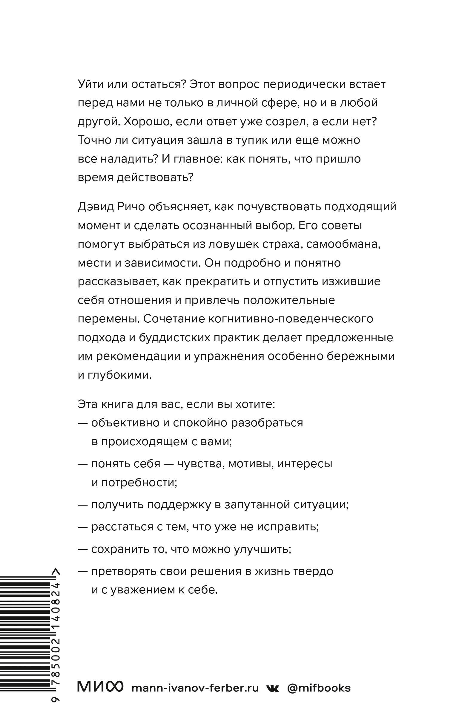 Дэвид Ричо, психотерапевт с 50-летним опытом и автор бестселлера "Эмоциональные триггеры", подробно и понятно рассказывает, как выбраться из собственных ментальных ловушек, сделать осознанный выбор в подходящий момент и привлечь в свою жизнь положительные перемены. Нам всем бывает необходимо принять решение, способное кардинальным образом изменить нашу жизнь. Уйти из отношений или остаться? Продолжать работать на нынешнем месте или уволиться? Уехать из дома (города, страны) или жить там, где сейчас? Словом, рискнуть и решиться на перемены или же оставить все по-прежнему? Хорошо, если ответ уже созрел, а если нет? Точно ли ситуация зашла в тупик или еще можно все наладить? И главное: как понять, что пришло время действовать? Как правило, сомнения появляются из-за внутренних установок, которые мешают сделать важный шаг. Это созависимость, неуверенность в себе, детские травмы, недостаток доверия. Дэвид Ричо разбирает, откуда они появляются, и объясняет, как с ними справиться. Эта книга для вас, если вы хотите: - объективно и спокойно разобраться в происходящем с вами; - понять себя - чувства, мотивы, интересы и потребности; - получить поддержку в запутанной ситуации; - расстаться с тем, что уже не исправить; - сохранить то, что можно улучшить; - претворять свои решения в жизнь твердо и с уважением к себе. Под обложкой - вопросы для саморефлексии, которые помогут проработать свои внутренние установки. Сочетание когнитивно-поведенческого подхода и буддистских практик делает упражнения особенно бережными и глубокими. В итоге вы сможете по-настоящему понять себя и начать действовать - идти вперед к лучшей жизни. Для кого книга: Для всех, кто хочет вырасти внутренне и расширить свои горизонты.| Издательство | МАНН, ИВАНОВ И ФЕРБЕР ООО |