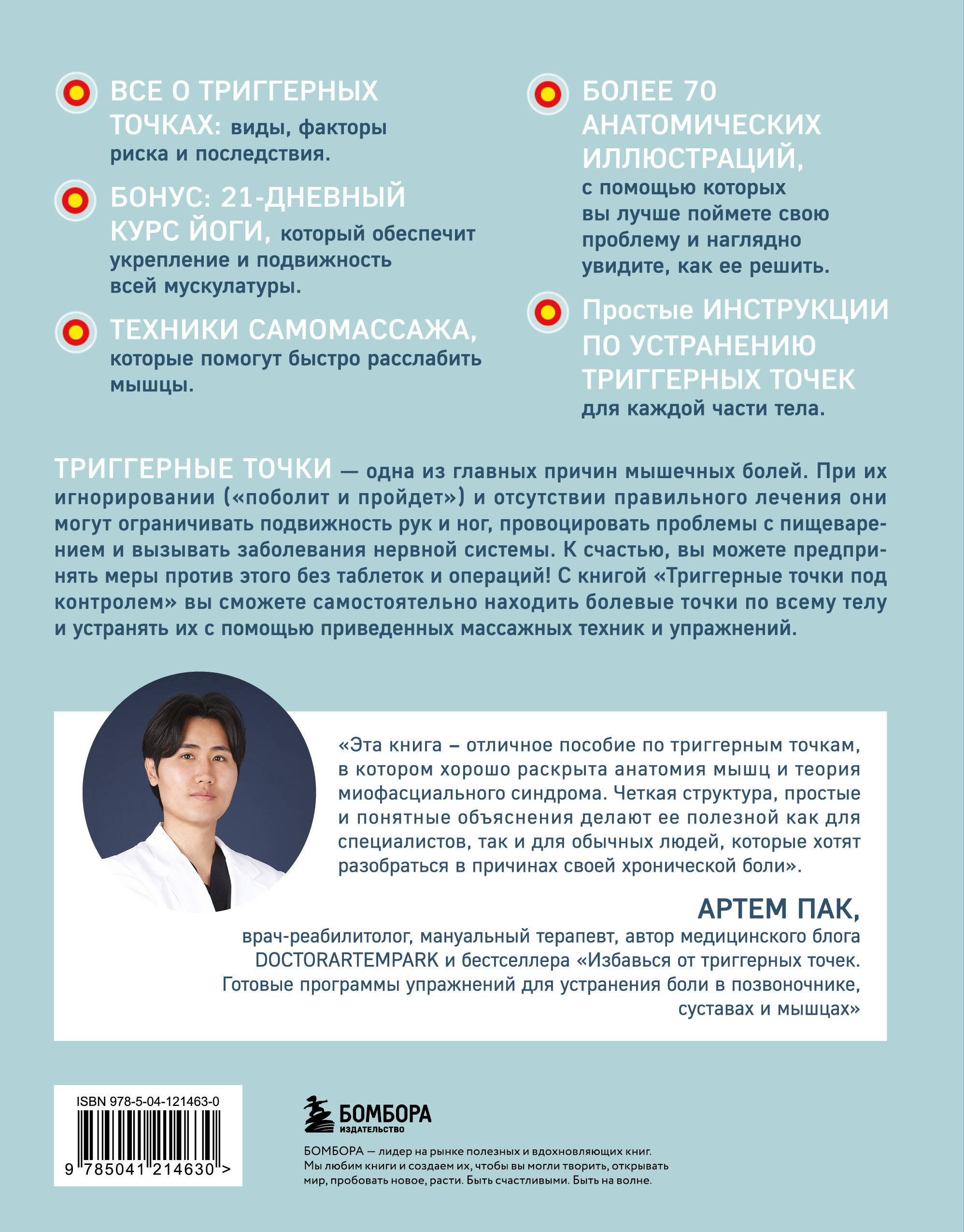 Вы испытываете усиливающиеся боли в спине, онемение рук, покалывание в пальцах или головокружение? Эти симптомы совершенно разные, но причина у них зачастую одна и та же - триггерные точки (локализованные узелковые уплотнения в мышцах и фасциях). Из-за разнообразных нагрузок, травм, долгого сидения мышцы становятся плотнее, теряют эластичность и остаются в постоянном напряжении. Триггерные точки являются причиной большинства случаев, связанных с мышечными болями. При их игнорировании («поболит и пройдет») и отсутствии правильного лечения они могут ограничивать подвижность рук и ног, провоцировать проблемы с пищеварением и вызывать заболевания нервной системы. Эта книга расскажет, как избавиться от триггерных точек без лекарств и хирургического вмешательства! Вы узнаете особенности и причины возникновения триггерных точек, научитесь определять их расположение и легко устранять. В книге вы найдете: - базовый курс по триггерным точкам: происхождение, виды, факторы риска и последствия; - техники самомассажа, которые помогут быстро расслабить мышцы; - более 70 анатомических иллюстраций, с помощью которых вы глубже погрузитесь в тему; - простые инструкции по устранению триггерных точек для каждой части тела; - бонус: 21-дневный курс йоги. С этой книгой вы избавитесь от боли в мышцах и фасциях благодаря высокоэффективной и при этом щадящей методике. Ваше здоровье в ваших руках - буквально!| Издательство | ООО "Издательство "Эксмо" |