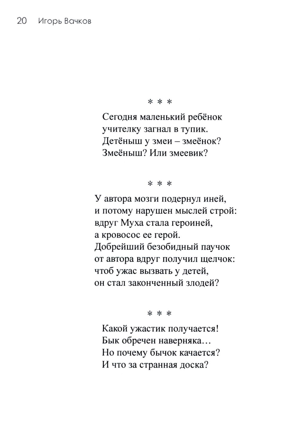 В этой книге Игорь Вачков предстаёт перед теми, кто принадлежит к одной с ним профессии, в не совсем привычном амплуа. У такого читателя вполне закономерно может возникнуть вопрос: зачем известному психологу, специалисту в области психологии образования и одному из создателей отечественной сказкотерапии, издавать книгу стихов, причём уже не первую? Игорь Вачков ненадолго оставляет читателя в раздумьях на эту тему, по сути отвечая уже в первом стихотворении: «Мотылек летит на свет. // И ему зачем-то надо». Так и стихи ищут свой путь к читателю, и выход в свет (почти на свет) поэтического сборника - естественное развитие этого стремления. И книга, и завершающее её программное стихотворение называются одинаково - «Трикстер». Кто это такой - трикстер? Несколько безответственный озорник, который хитростью пытается поменять ход вещей - иногда ради самих этих изменений? Как говорил (точнее, пел) небезызвестный сын турецко-подданного в версии Юлия Кима, «О, наслажденье скользить по краю, //Замрите, ангелы, смотрите, я играю, //Моих грехов разбор оставьте до поры,// Вы оцените красоту игры». Игра ради игры - вот в чём многие видят суть трикстера, будь то скандинавское божество или мелкий аферист. Но, пожалуй, автор этой книги - отнюдь не трикстер, он не лукавит и не играет с читателем в сомнительные игры. Впрочем, и отсылает он, вероятно, не к идее трикстера-игрока, а к юнговскому архетипу героя, способного избежать опасности и одержать верх в любых испытаниях благодаря хитрости и уму. Именно такими героями щедро населены как народные, так и литературные сказки.| Издательство | БахраХ-М |