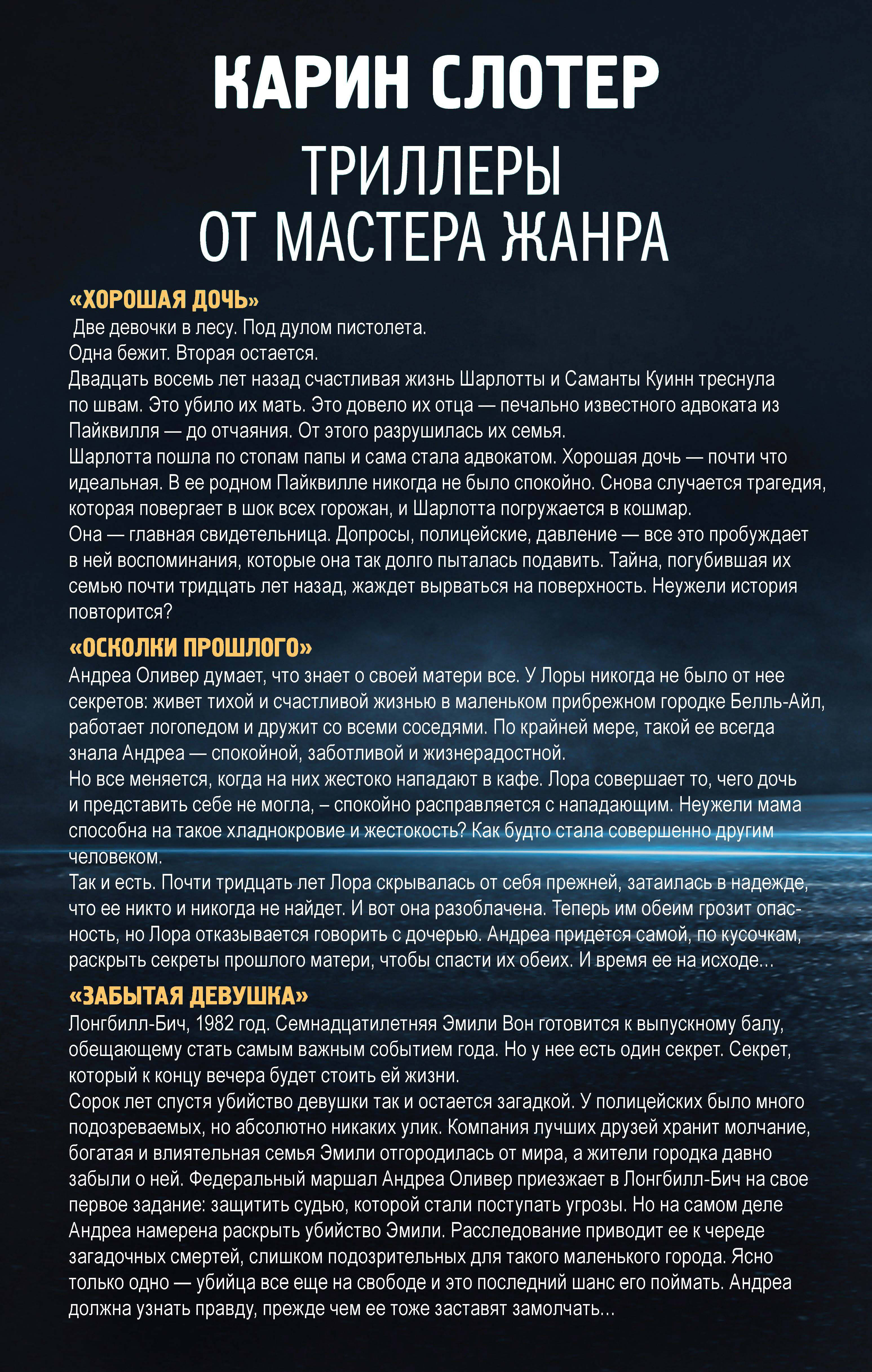 Комплект из 3-х лучших книг от автора мировых бестселлеров Карин Слотер - одной из самых известных и признанных писательниц в мире, лауреата премии «Эдгар». Ее читают в 120 странах, ее новинки мгновенно попадают в список бестселлеров New York Times. В комплекте собраны две книги из цикла об Андреа Оливер «Осколки прошлого» и «Забытая девушка», а также самостоятельный роман «Хорошая дочь». «Хорошая дочь» Две девочки в лесу. Под дулом пистолета. Одна бежит. Вторая остается. Двадцать восемь лет назад счастливая жизнь Шарлотты и Саманты Куинн треснула по швам. Это убило их мать. Это довело их отца - печально известного адвоката из Пайквилля - до отчаяния. От этого разрушилась их семья. Шарлотта пошла по стопам папы и сама стала адвокатом. Хорошая дочь - почти что идеальная. В ее родном Пайквилле никогда не было спокойно. Снова случается трагедия, которая повергает в шок всех горожан, и Шарлотта погружается в кошмар. Она - главная свидетельница. Допросы, полицейские, давление - все это пробуждает в ней воспоминания, которые она так долго пыталась подавить. Тайна, погубившая их семью почти тридцать лет назад, жаждет вырваться на поверхность. Неужели история повторится? «Осколки прошлого» Андреа Оливер думает, что знает о своей матери все. У Лоры никогда не было от нее секретов: живет тихой и счастливой жизнью в маленьком прибрежном городке Белль-Айл, работает логопедом и дружит со всеми соседями. По крайней мере, такой ее всегда знала Андреа - спокойной, заботливой и жизнерадостной. Но все меняется, когда на них жестоко нападают в кафе. Лора совершает то, чего дочь и представить себе не могла, - спокойно расправляется с нападающим. Неужели мама способна на такое хладнокровие и жестокость? Как будто стала совершенно другим человеком. Так и есть. Почти тридцать лет Лора скрывалась от себя прежней, затаилась в надежде, что ее никто и никогда не найдет. И вот она разоблачена. Теперь им обеим грозит опасность, но Лора отказывается говорить с дочерью. Андреа придется самой, по кусочкам, раскрыть секреты прошлого матери, чтобы спасти их обеих. И время ее на исходе… «Забытая девушка» Лонгбилл-Бич, 1982 год. Семнадцатилетняя Эмили Вон готовится к выпускному балу, обещающему стать самым важным событием года. Но у нее есть один секрет. Секрет, который к концу вечера будет стоить ей жизни. Сорок лет спустя убийство девушки так и остается загадкой. У полицейских было много подозреваемых, но абсолютно никаких улик. Компания лучших друзей хранит молчание, богатая и влиятельная семья Эмили отгородилась от мира, а жители городка давно забыли о ней. Федеральный маршал Андреа Оливер приезжает в Лонгбилл-Бич на свое первое задание: защитить судью, которой стали поступать угрозы. Но на самом деле Андреа намерена раскрыть убийство Эмили. Расследование приводит ее к череде загадочных смертей, слишком подозрительных для такого маленького города. Ясно только одно - убийца все еще на свободе, и это последний шанс его поймать. Андреа должна узнать правду, прежде чем ее тоже заставят замолчать…| Издательство | ООО "Издательство "Эксмо" |