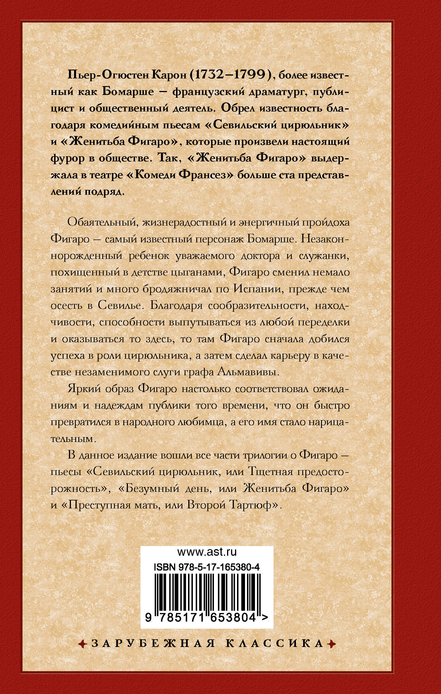 Обаятельный, жизнерадостный и энергичный пройдоха Фигаро - самый известный персонаж Бомарше. Незаконнорожденный ребенок уважаемого доктора и служанки, похищенный в детстве цыганами, Фигаро сменил немало работ и много бродяжничал по Испании, прежде чем осесть в Севилье. Благодаря сообразительности, находчивости, способности выпутаться из любой переделки и оказываться то здесь, то там Фигаро сначала добился успеха в роли цирюльника, а затем сделал карьеру в качестве незаменимого слуги графа Альмавивы. Яркий образ Фигаро настолько соответствовал ожиданиям и надеждам публики того времени, что он быстро превратился в народного любимца, а его имя стало нарицательным. В данное издание вошли все части трилогии о Фигаро - пьесы "Севильский цирюльник, или Тщетная предосторожность", "Безумный день, или Женитьба Фигаро" и "Преступная мать, или Второй Тартюф".| Издательство | Издательство "АСТ" |