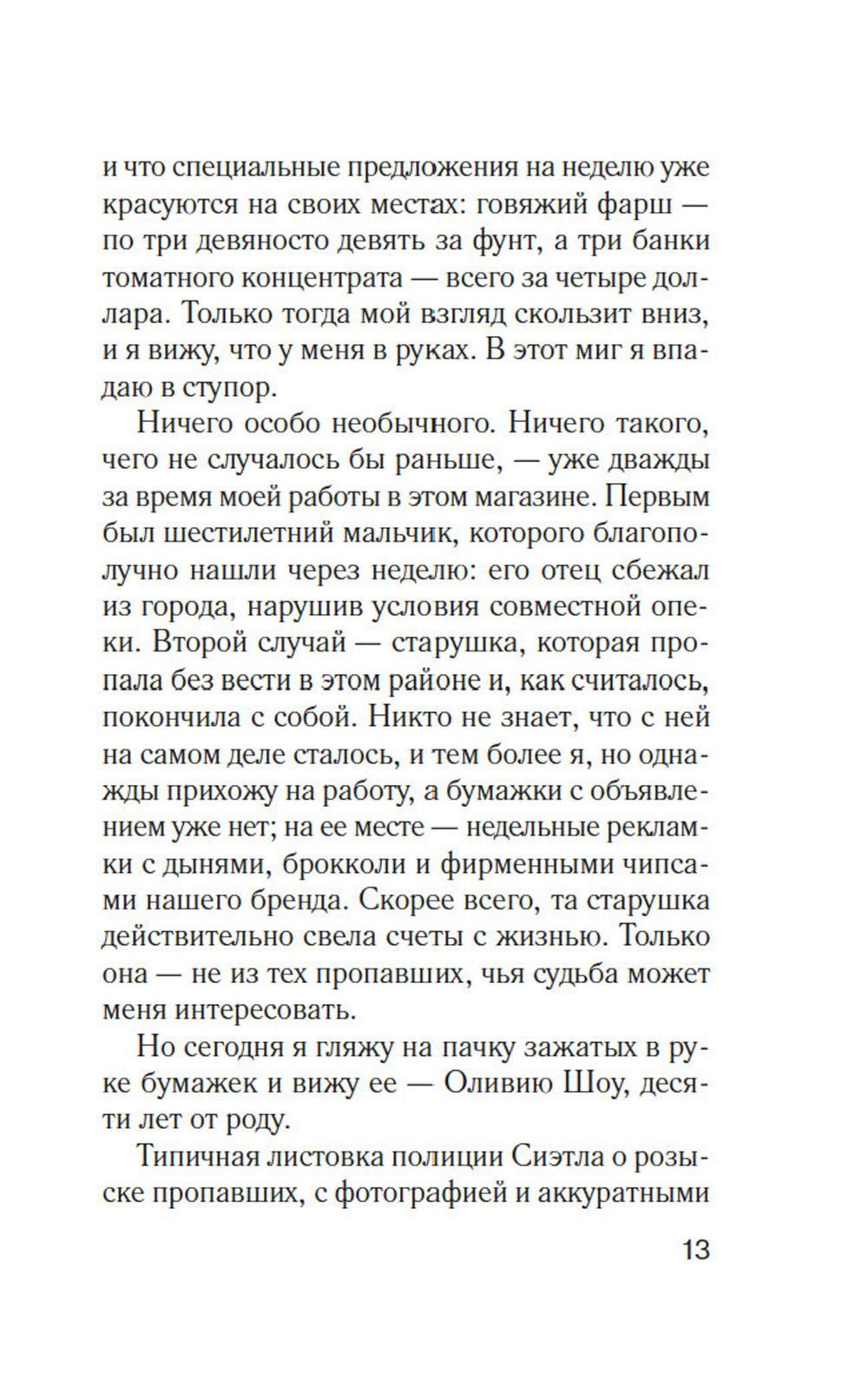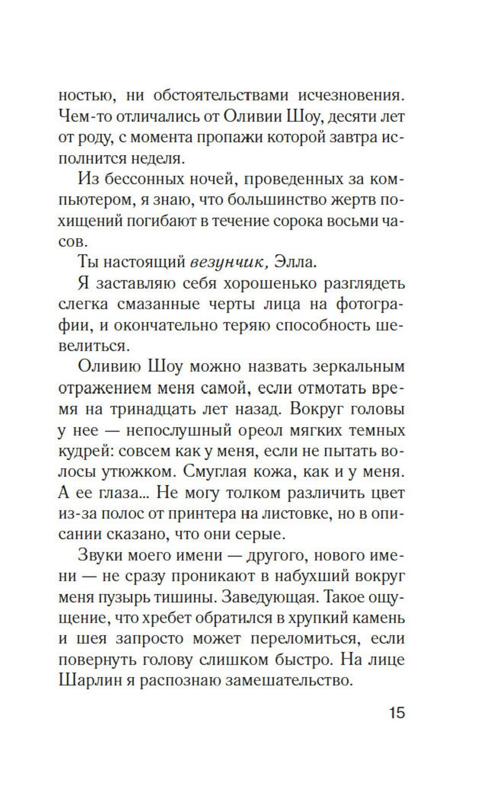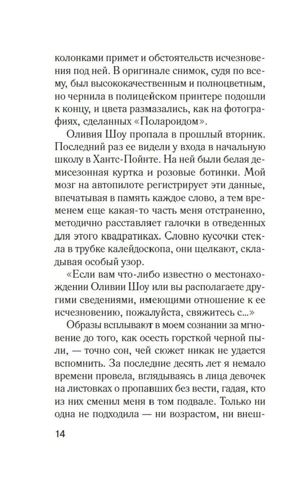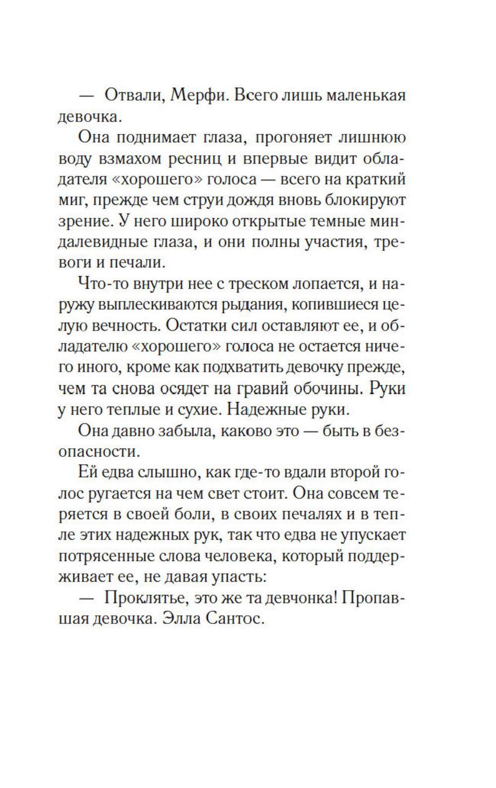 СОДЕРЖИТ ИНФОРМАЦИЮ О НАРКОТИЧЕСКИХ ИЛИ ПСИХОТРОПНЫХ ВЕЩЕСТВАХ, УПОТРЕБЛЕНИЕ КОТОРЫХ ОПАСНО ДЛЯ ЗДОРОВЬЯ. ИХ НЕЗАКОННЫЙ ОБОРОТ ВЛЕЧЕТ УГОЛОВНУЮ ОТВЕТСТВЕННОСТЬ. Насилие калечит и тело, и душу, ломает судьбы людей. Тринадцать лет назад маньяк похитил десятилетнюю Эллу Сантос, а через три года отпустил. Беременную. Теперь Элла носит имя Лэйн Морено и под длинными рукавами скрывает жуткие шрамы. Она работает где придется, живет словно на вокзале. Посещает психолога, употребляет антидепрессанты, а мысли о самоубийстве и страшные воспоминания отгоняет наркотиками и алкоголем. Никому на свете не доверяет. Но вот однажды с листовки о пропавших детях на Лэйн смотрит удивительно знакомое лицо: десятилетняя Оливия, совсем такая, как она сама в детстве. Дело поручено детективу Шону Ортису, именно он нашел Лэйн на обочине дороги десять лет назад и был добр к ней. Только достаточно ли это веская причина, чтобы она стала сотрудничать со следствием?..