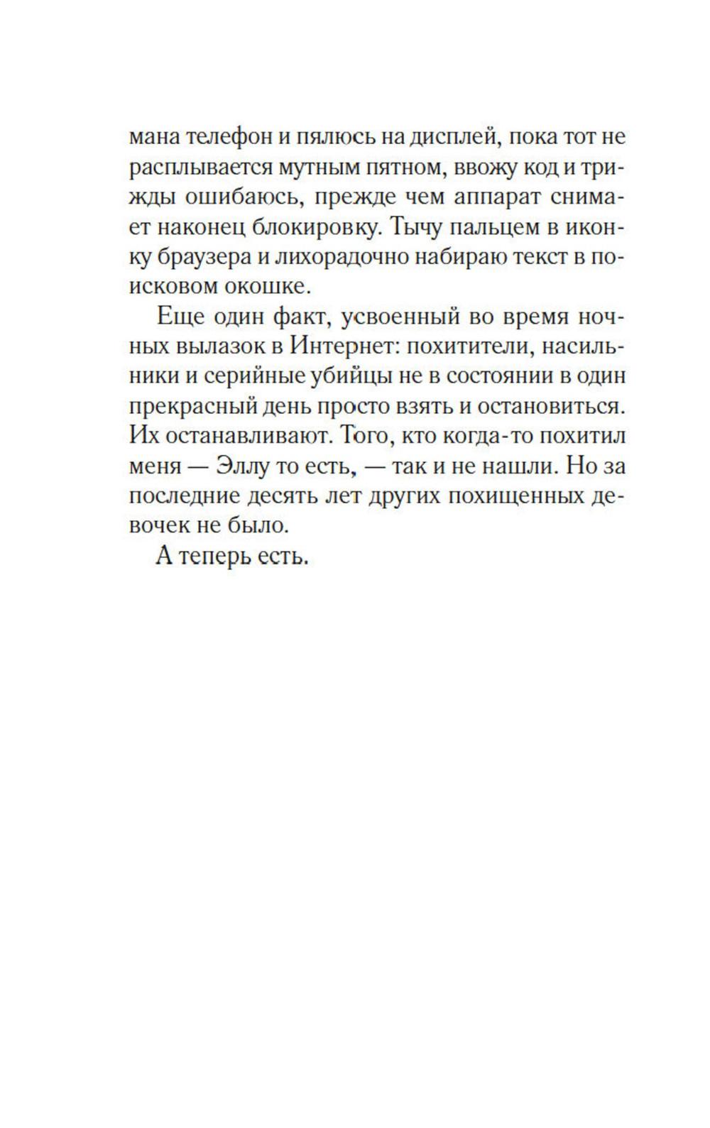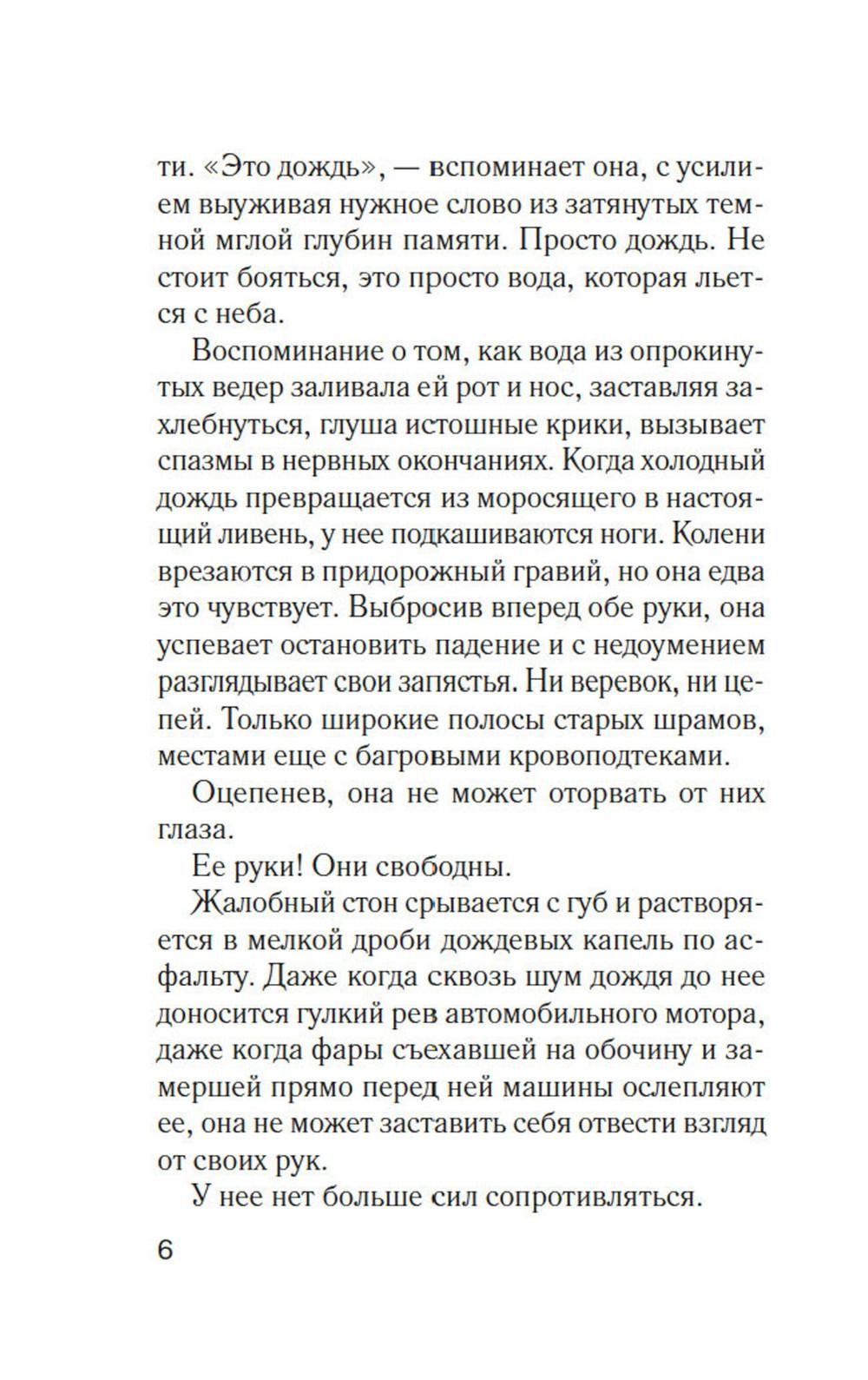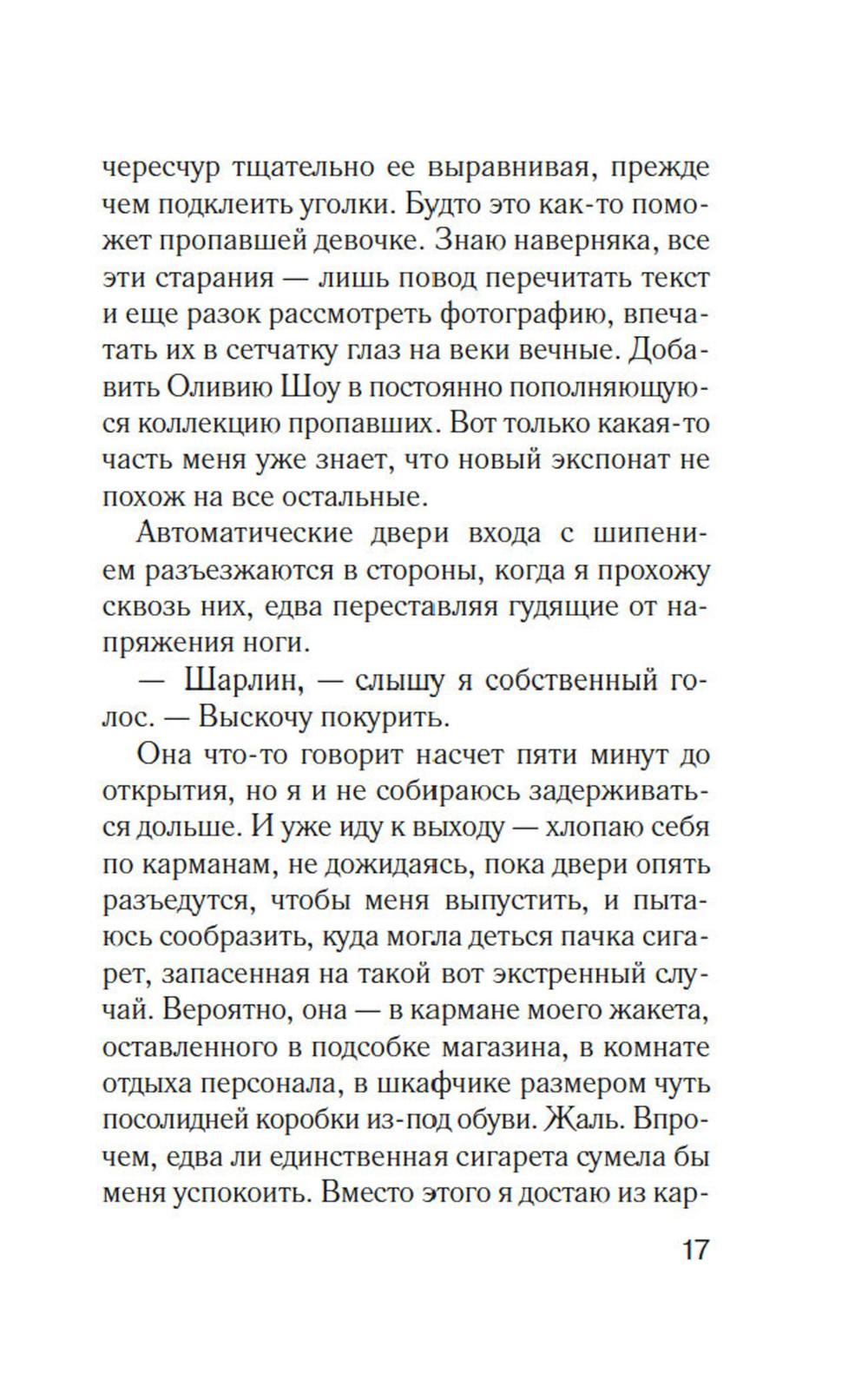 СОДЕРЖИТ ИНФОРМАЦИЮ О НАРКОТИЧЕСКИХ ИЛИ ПСИХОТРОПНЫХ ВЕЩЕСТВАХ, УПОТРЕБЛЕНИЕ КОТОРЫХ ОПАСНО ДЛЯ ЗДОРОВЬЯ. ИХ НЕЗАКОННЫЙ ОБОРОТ ВЛЕЧЕТ УГОЛОВНУЮ ОТВЕТСТВЕННОСТЬ. Насилие калечит и тело, и душу, ломает судьбы людей. Тринадцать лет назад маньяк похитил десятилетнюю Эллу Сантос, а через три года отпустил. Беременную. Теперь Элла носит имя Лэйн Морено и под длинными рукавами скрывает жуткие шрамы. Она работает где придется, живет словно на вокзале. Посещает психолога, употребляет антидепрессанты, а мысли о самоубийстве и страшные воспоминания отгоняет наркотиками и алкоголем. Никому на свете не доверяет. Но вот однажды с листовки о пропавших детях на Лэйн смотрит удивительно знакомое лицо: десятилетняя Оливия, совсем такая, как она сама в детстве. Дело поручено детективу Шону Ортису, именно он нашел Лэйн на обочине дороги десять лет назад и был добр к ней. Только достаточно ли это веская причина, чтобы она стала сотрудничать со следствием?..
