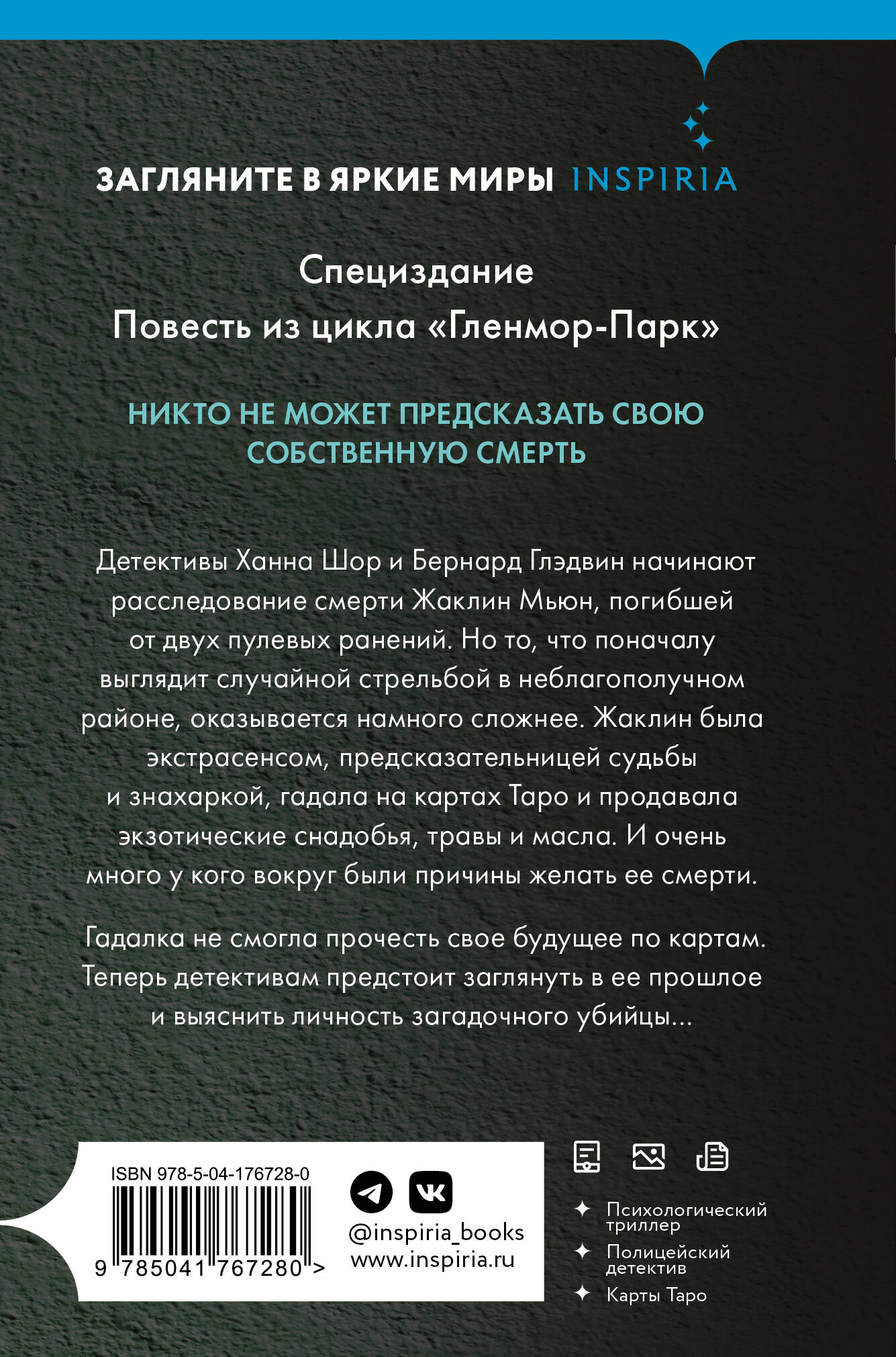 ОТ АВТОРА «ВНУТРИ УБИЙЦЫ». ПОВЕСТЬ ИЗ ЦИКЛА «ГЛЕНМОР-ПАРК». Никто не может предсказать свою собственную смерть… Детективы Ханна Шор и Бернард Глэдвин начинают расследование смерти Жаклин Мьюн, погибшей от двух пулевых ранений. Но то, что поначалу выглядит случайной стрельбой в неблагополучном районе, оказывается намного сложнее. Жаклин была экстрасенсом, предсказательницей судьбы и знахаркой, гадала на картах Таро и продавала экзотические снадобья, травы и масла. И очень много у кого вокруг были причины желать ее смерти. Гадалка не смогла прочесть свое будущее по картам. Теперь детективам предстоит заглянуть в ее прошлое и выяснить личность загадочного убийцы… ___________________________________________________________________ «Майк Омер блестяще доказал, что может успешно писать не только в крупных формах, но и в малых. Его бесспорное умение выстраивать детективный сюжет, мастерство рассказчика и теплый, ненавязчивый юмор делают эту повесть небольшой, но изысканной жемчужиной остросюжетного жанра». - Владимир Хорос, редактор| Издательство | ООО "Издательство "Эксмо" |