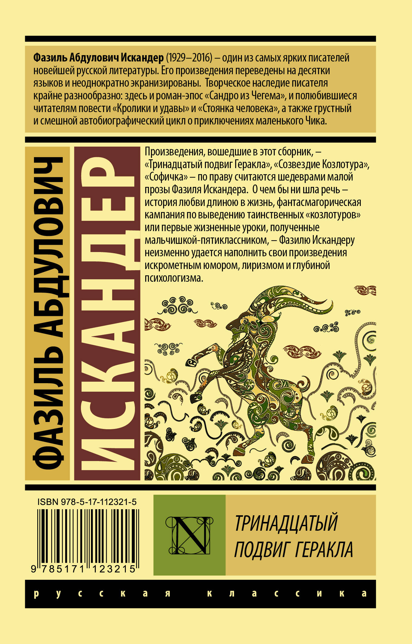 Произведения, вошедшие в этот сборник, - "Тринадцатый подвиг Геракла", "Созвездие Козлотура", "Софичка" - по праву считаются шедеврами малой прозы Фазиля Искандера. О чем бы ни шла речь - история любви длиною в жизнь, фантасмагорическая кампания по выведению таинственных "козлотуров" или первые жизненные уроки, полученные мальчишкой-пятиклассником, - Фазилю Искандеру неизменно удается наполнить свои произведения искрометным юмором, лиризмом и глубиной психологизма.| Издательство | ИЗДАТЕЛЬСТВО "АСТ" |