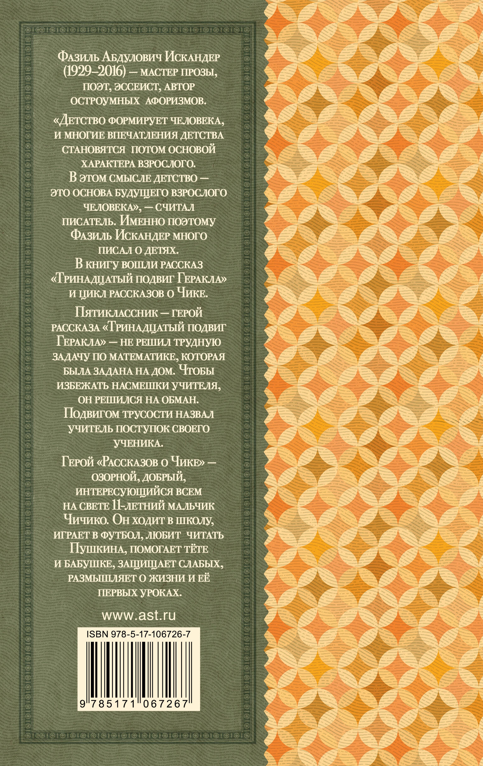 Фазиль Абдулович Искандер (1929-2016) - мастер прозы, поэт, эссеист, автор остроумных афоризмов. "Детство формирует человека, и многие впечатления детства становятся потом основой характера взрослого. В этом смысле детство - это основа будущего взрослого человека", - считал писатель. Именно поэтому Фазиль Искандер много писал о детях. В книгу вошли рассказ "Тринадцатый подвиг Геракла" и цикл рассказов о Чике. Пятиклассник - герой рассказа "Тринадцатый подвиг Геракла" - не решил трудную задачу по математике, которая была задана на дом. Чтобы избежать насмешки учителя, он решился на обман. Подвигом трусости назвал учитель поступок своего ученика. Герой "Рассказов о Чике" - озорной, добрый, интересующийся всем на свете 11-летний мальчик Чичико. Он ходит в школу, играет в футбол, любит читать Пушкина, помогает тёте и бабушке, защищает слабых, размышляет о жизни и её первых уроках. Чик - заводила в компании. Придумывает разные невероятные приключения и выходит из них героем, не задумываясь, бросается на помощь и спешит делать добро. Он вступает в отчаянную схватку со страшным собаколовом и спасает всех бродячих собак от неминуемой гибели. Рассказы написаны так достоверно и доверительно, что каждый юный читатель может легко отождествить себя с Чиком и с большим интересом следить за его приключениями.