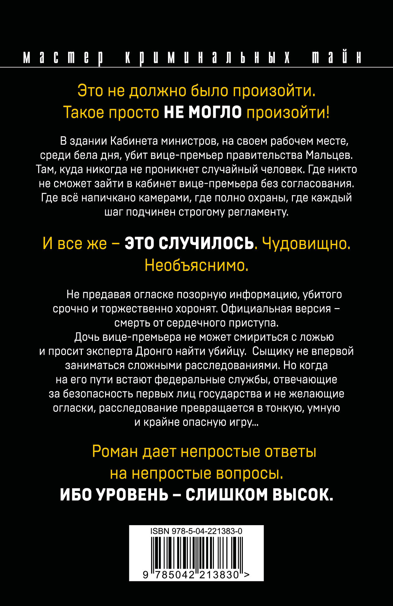 Ошеломительный детектив о преступлении в высших эшелонах власти. Знаменитый эксперт Дронго расследует преступление там, где государственные тайны хранят, как нигде в мире. Это не должно было произойти. Такое просто НЕ МОГЛО произойти! В здании кабинета министров, на своем рабочем месте, среди бела дня, убит вице-премьер правительства Мальцев. Там, куда никогда не проникнет случайный человек. Где никто не сможет зайти в кабинет вице-премьера без согласования. Где все напичкано камерами, где полно охраны, где каждый шаг подчинен строгому регламенту. И все же - это случилось. Чудовищно. Необъяснимо. Не предавая огласке позорную информацию, убитого срочно и торжественно хоронят. Официальная версия - смерть от сердечного приступа. Дочь вице-премьера не может смириться с ложью и просит эксперта Дронго найти убийцу. Сыщику не впервой заниматься сложными расследованиями. Но когда на его пути встают федеральные службы, отвечающие за безопасность первых лиц государства и не желающие огласки, то расследование превращается в тонкую, умную и крайне опасную игру… Роман дает непростые ответы на непростые вопросы. Ибо уровень - слишком высок. Чингиз Абдуллаев родился 7 апреля 1959 года в Баку. Член Союза писателей СССР с 1989 года. Президент ПЕН-клуба Азербайджана. Его жизнь не менее интересна, чем его книги. Кавалер Орденов Ленина, Красного Знамени, Красной Звезды. Награжден Орденом Славы независимого Азербайджана. Почетный офицер отрядов спецназа пяти государств, среди которых и легендарная грузинская «Омега». Американская «Крисчен Сaйенс Монитор» назвала его одним из лучших авторов в жанре политического детектива. Книги автора переведены на двадцать семь языков и изданы в странах СНГ и Прибалтики, в США, Франции, Швеции, Норвегии, Турции, Румынии, Израиле, Болгарии, Сербии, Албании. Общий тираж превышает двадцать четыре миллиона экземпляров. По романам писателя снято семь фильмов и два сериала.| Издательство | ООО "Издательство "Эксмо" |