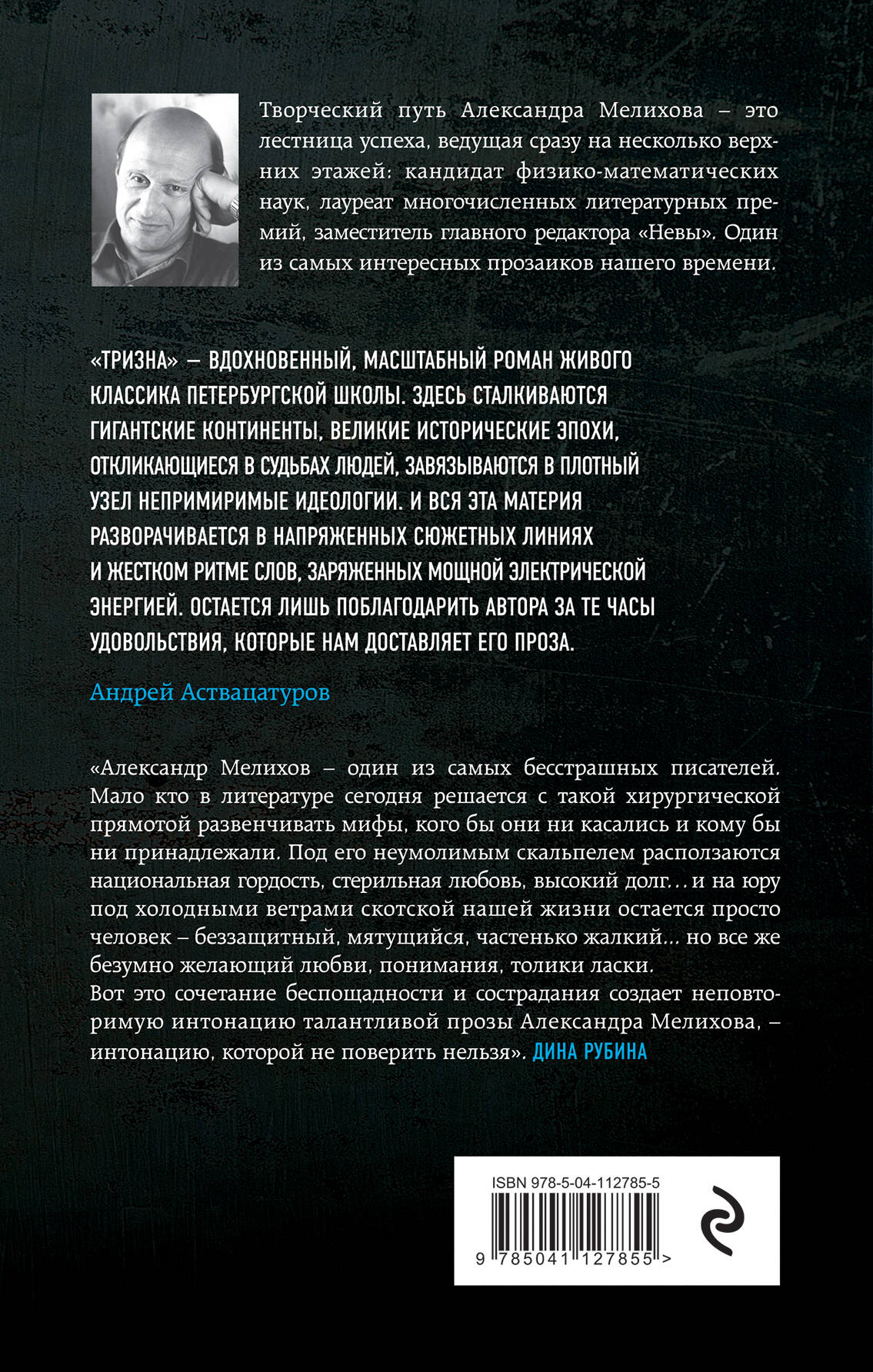 «Тризна» - вдохновенный, масштабный роман живого классика петербургской школы. Здесь сталкиваются гигантские континенты, великие исторические эпохи, откликающиеся в судьбах людей, завязываются в плотный узел непримиримые идеологии. И вся эта материя разворачивается в напряжённых сюжетных линиях и жёстком ритме слов, заряженных мощной электрической энергией. Остаётся лишь поблагодарить автора за те часы удовольствия, которые нам доставляет его проза». - Андрей Аствацатуров «Александр Мелихов - один из самых бесстрашных писателей. Мало кто в литературе сегодня решается с такой хирургической прямотой развенчивать мифы, кого бы они ни касались и кому бы ни принадлежали. Под его неумолимым скальпелем расползаются национальная гордость, стерильная любовь, высокий долг… и на юру под холодными ветрами скотской нашей жизни остается просто человек - беззащитный, мятущийся, частенько жалкий… но все же безумно желающий любви, понимания, толики ласки. Вот это сочетание беспощадности и сострадания создает неповторимую интонацию талантливой прозы Александра Мелихова, - интонацию, которой не поверить нельзя». - Дина Рубина «Александр Мелихов прославился «романами идей» - в этом жанре сегодня отваживаются работать немногие… В своём новом романе Александр Мелихов решает труднейшую задачу за всю свою карьеру: он описывает американский миф и его влияние на русскую жизнь. Эта книга о многом - но прежде всего о таинственных институтах, где ковалась советская мощь, и о том, как формировалось последнее советское поколение, самое перспективное, талантливое и невезучее. Из всех книг Мелихова со времён «Чумы» эта книга наиболее увлекательна и требует от читателя минимальной подготовки - достаточно жить в России и смотреть по сторонам». - Дмитрий Быков «Замечательный писатель Александр Мелихов написал свой главный роман. Грандиозные события, проехавшиеся по нам в последние десятилетия, уже начали закрываться туманом забвения, фотографиями собачек и тортиков на экранчиках смартфонов. И вдруг - роман Мелихова «Тризна», траурные проводы исчезнувшей было Вселенной - огромной, опасной и, что самое тревожное - состоящей из наших жизней, прожитых нами. Великое поколение! Сколько раз мы подвергались опасности, в том числе и со стороны нашего государства, как мы рисковали - и все равно, в результате делали то, что хотели, что считали нужным. Сейчас так никто не может! Великое поколение, победившее тоталитаризм... и погубленное наступившей после него эпохой, которой до сих пор так и не удалось подобрать названия. Какие звезды сверкали в прежней Вселенной! В романе вокруг его эпицентра, главного героя Олега, какие траектории накручивают персонажи - казахи, евреи, русские, каждый со своим национальным характером, со своей придурью и главным страстным желанием - состояться. И ведь ничего не боялись! А если и боялись, то все равно делали. А какие женщины... Эх, мне бы! Жаль, не попались, - а таких уже нет. Последнее творение Мелихова счастливо сочетает в себе основательность советского производственного романа, лихость западного боевика и вестерна, страстность и высокую художественность русской классики: все сошлось здесь в бешеном хороводе, из которого не вырвешься, пока не кончится этот роман. Его, безусловно, можно поставить в ряд самых больших литературны
