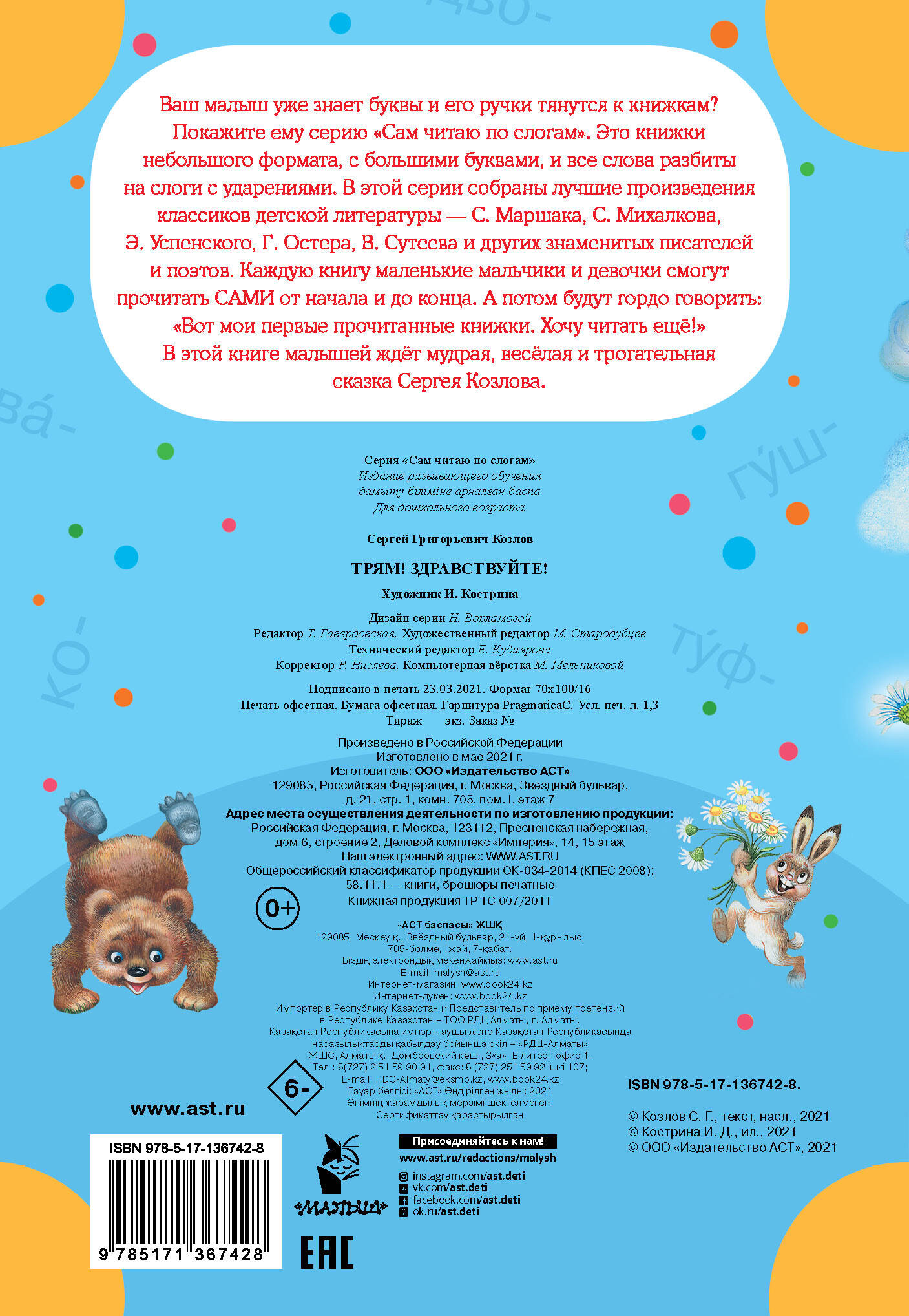 Ваш малыш уже знает буквы и его ручки тянутся к книжкам? Покажите ему серию "Сам читаю по слогам". Это книжки небольшого формата, с большими буквами, и все слова разбиты на слоги с ударениями. В этой серии собраны лучшие произведения классиков детской литературы - С. Маршака, С. Михалкова, Э. Успенского, Г. Остера, В. Сутеева и других знаменитых писателей и поэтов. Каждую книгу маленькие мальчики и девочки смогут прочитать САМИ от начала и до конца. А потом будут гордо говорить: "Вот мои первые прочитанные книжки. Хочу читать ещё!" В этой книге малышей ждёт встреча с мудрой, весёлой и трогательной сказкой Сергея Козлова "Трям! Здравствуйте!". Для дошкольного возраста.| Издательство | ИЗДАТЕЛЬСТВО "АСТ" |