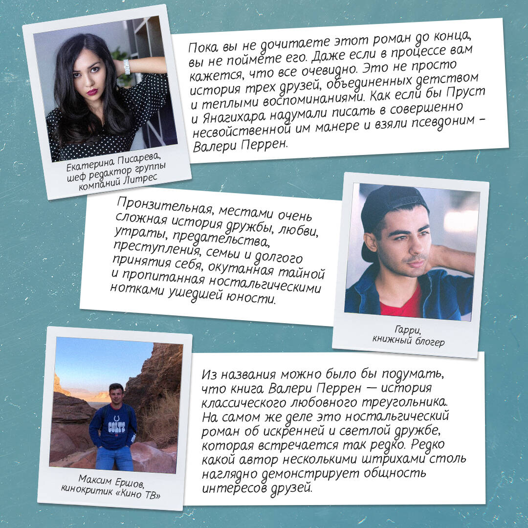 НОВЫЙ РОМАН ОТ АВТОРА «ПОМЕНЯЙ ВОДУ ЦВЕТАМ», ПЕРЕВЕДЕННОГО НА 26 ЯЗЫКОВ. «Этот роман - настоящий самородок». - Le Parisien «Валери Перрен - очень талантливая рассказчица». - Elle *** 1986 год Нина, Этьен и Адриен - трио друзей, они учатся в одной школе, их объединяют общие идеалы и секреты. Они клянутся, став старше, уехать из провинции и обосноваться в Париже. Друзья очень близки, о чем знают все в их небольшом городе. Наши дни Судьбы трех друзей сложились совсем иначе, чем кто-либо предполагал. Счастливы ли Нина, Этьен или Адриен? Они изменились и совсем не разговаривают друг с другом, за их плечами неудачные романы и горести взрослой жизни. И теперь журналистка Виржини, которая знала их всю жизнь и восхищалась ими как никто другой, есть что рассказать. О них и о тайнах, которые трое друзей скрывают годами. Это история о несбывшихся детских мечтах и о драгоценных узах, которые никогда не поздно вернуть к жизни. Что бы вы ни совершили в прошлом. *** «Меня зовут Виржини. Сегодня из трех друзей со мной разговаривает только Адриен. Нина меня презирает. С Этьеном я сама не желаю иметь дела. А между тем, они с детства завораживают меня. С самого детства и по сию пору я чувствую привязанность только к этой троице».