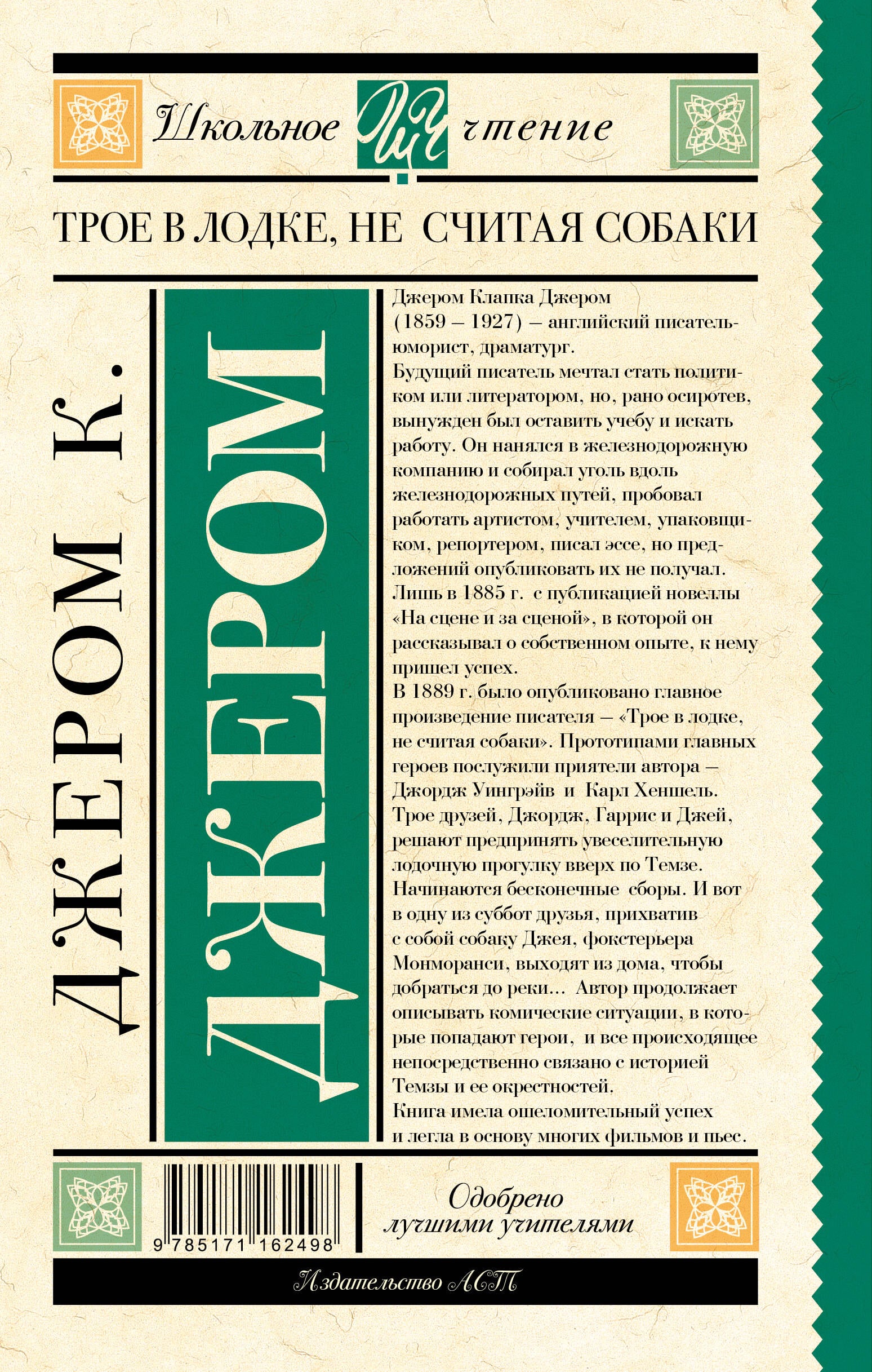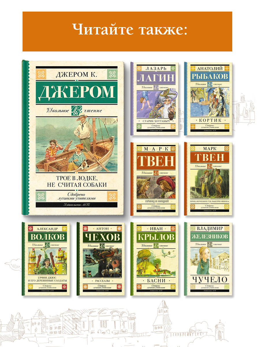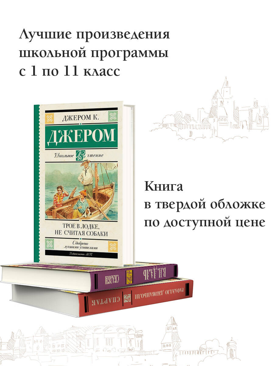 Английский писатель-юморист, драматург Джером Капка Джером (1859-1927) в юности мечтал стать политиком или литератором, но рано осиротев, вынужден был оставить учебу и искать работу. Он нанялся в железнодорожную компанию и собирал уголь вдоль железнодорожных путей, пробовал работать артистом, учителем, упаковщиком, репортером, писал эссе, но предложений опубликовать их не получал. Лишь в 1885 г. с публикацией новеллы «На сцене и за сценой», в которой он рассказывал о собственном опыте, к нему пришел успех. В 1889 г. было опубликовано главное произведение писателя - «Трое в лодке, не считая собаки». Прототипами главных героев послужили приятели автора - Джордж Уингрэйв и Карл Хеншель. Трое друзей, Джордж, Гаррис и Джей, решают предпринять увеселительную лодочную прогулку вверх по Темзе. Начинаются бесконечные сборы. И вот в одну из суббот друзья, прихватив с собой собаку Джея, фокстерьера Монморанси, выходят из дома, чтобы добраться до реки… Автор продолжает описывать комические ситуации , в которые попадают герои, и все происходящее непосредственно связано с историей Темзы и ее окрестностей. Книга имела ошеломительный успех и легла в основу многих фильмов и пьес.| Издательство | Издательство "АСТ" |
