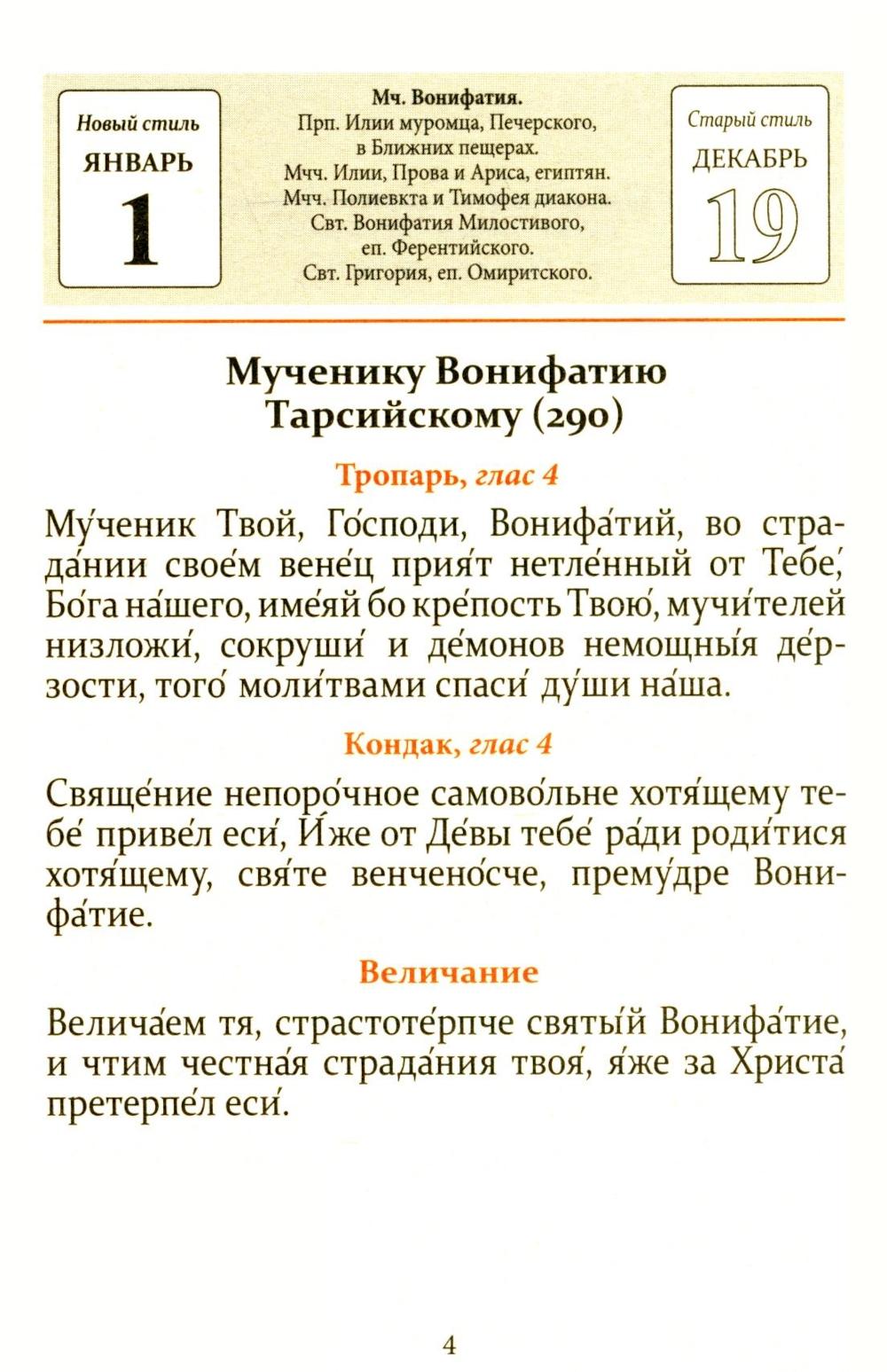 Данный сборник представляет собой церковный месяцеслов, соединенный с избранными тропарями, кондаками и величаниями на каждый день календарного года. Книгу можно использовать как на клиросе в храмах, так и для домашней молитвы. Для молитвы тем святым, молитвословия которым в сборнике не приводятся, можно использовать общий тропарь из приложения 4.| Издательство | Библиополис |