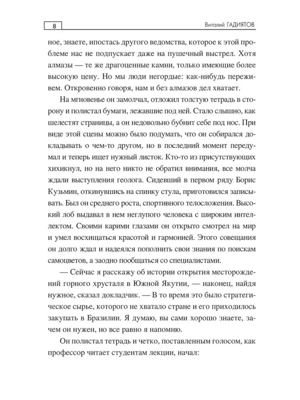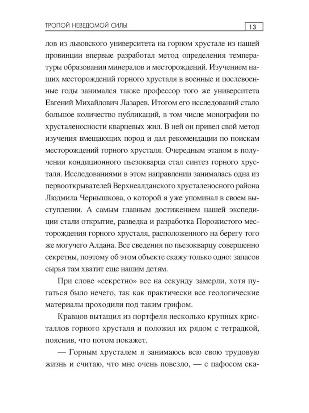 На одном из якутских месторождений работает уникальный геолог, который улавливает некие таинственные сигналы, испускаемые кристаллами горного хрусталя. Для встречи с ним отправляется аспирант университета Борис Кузьмин. Он организует экспедицию в тайгу с целью поиска коллекционных минералов и артефактов, спрятанных в заброшенном поселке горняков. Исследователей ждут необыкновенные приключения, уникальные открытия и щедрые подарки судьбы, а также загадочные встречи, способные пролить свет на возможность кремниевой жизни.| Издательство | Вече |