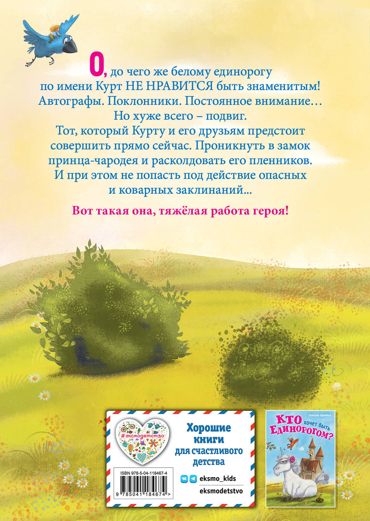 Однажды белоснежный единорог, прекрасная принцесса и маленькая болтливая птичка решили напасть на замок принца… Странное начало сказки, скажете вы? И будете правы! Но что остаётся Курту и его друзьям, если принц оказался злым волшебником? Кто, кроме них, спасёт его пленников - заколдованных зверей? Так что вперёд, навстречу подвигам, приключениям и новым неожиданным встречам! Ведь диковинный зверь с двумя рогами, который пасётся на той опушке, кажется, тоже единорог. Только очень, очень необычный… Перед вами смешная и увлекательная история о приключениях единорога (конечно, волшебного) и принцессы (разумеется, доброй и красивой). Книжка отлично подойдёт для тех, кто начинает читать сам, ведь здесь много цветных иллюстраций и удобный крупный шрифт. Вторая книга серии. (Но читать можно начинать и с неё). Рекомендуется для девочек 6-8 лет.| Издательство | Эксмо |